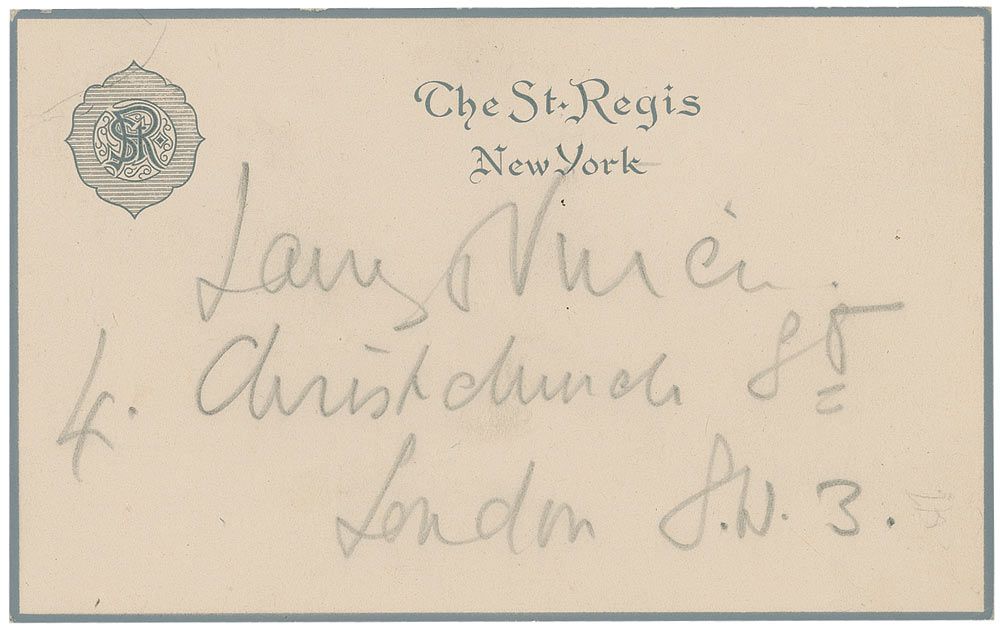 Handwritten address, in pencil, on a 5.25 x 3.25 embossed St. Regis Hotel card. Leigh writes: “Larry & Vivien, 4 Christ Church St., London S. W. 3.” In fine condition, with a couple of stray pencil marks.