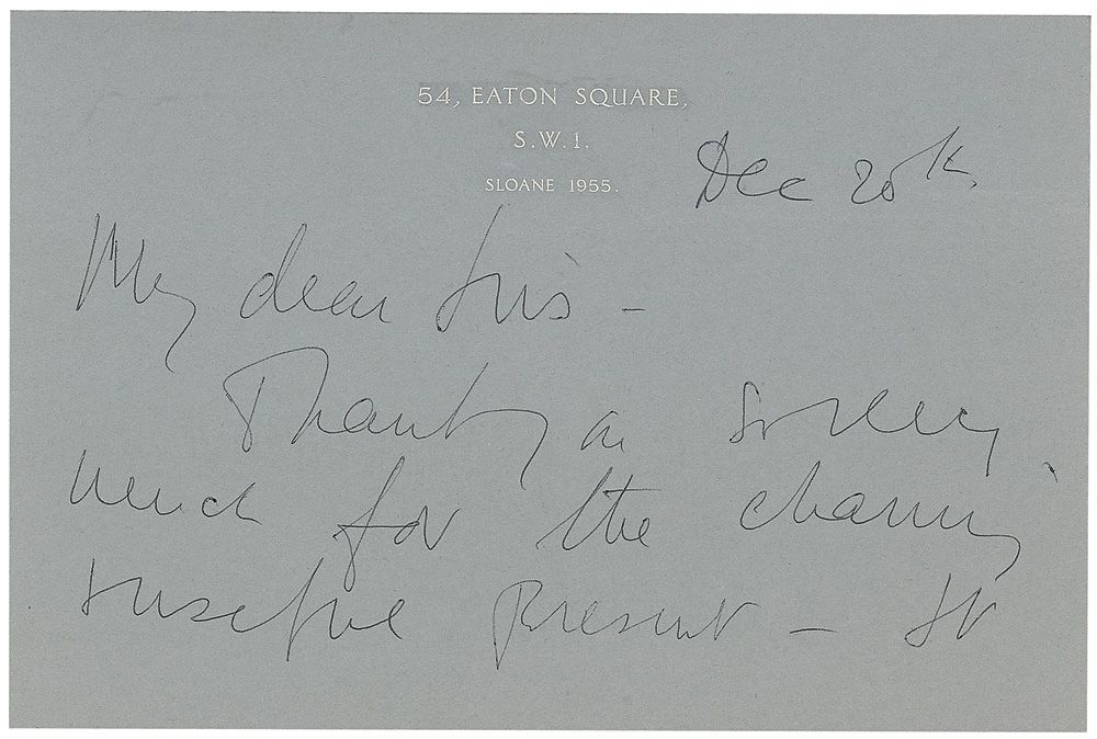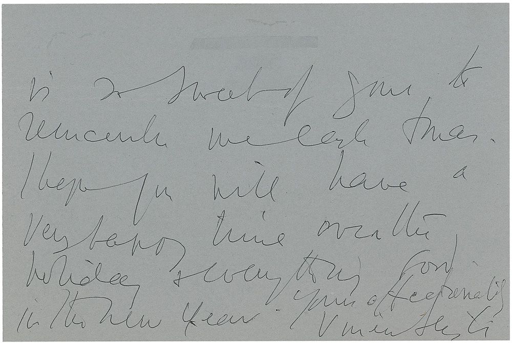 ALS signed “Viven Leigh,” one page both sides, 6 x 4, personal letterhead, December 20. A letter of thanks and well-wishes for the holidays and new year. In part: “Thank you so very much for the charming & useful present—it is so nice of you to remember me.” In fine condition, with a light horizontal crease to the top. Accompanied by the original mailing envelope addressed in her hand, with scattered surface loss affecting the address.
