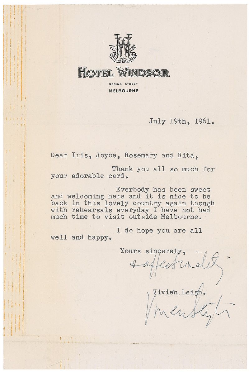 TLS, one page, 6 x 9, Hotel Windsor Melbourne letterhead, July 19, 1961. A letter to a friend. In part: “Everybody has been sweet and welcoming here and it is nice to be back in this lovely country again though with rehearsals everyday I have not had much time to visit outside Melbourne.” Intersecting folds, a horizontal crease, and irregular toning to the left edge, otherwise fine condition. At the time of the letter, Leigh was on a theatre tour through Australia and New Zealand.