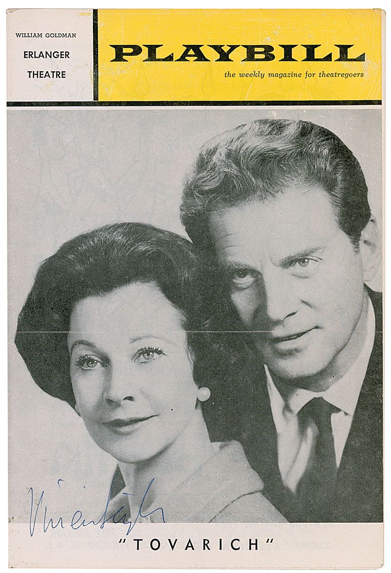 Playbill from the Erlanger Theatre’s presentation of Tovarich, 6 x 9, 24 pages. Signed on the cover in blue ink by Leigh. Mild handling wear and creasing, otherwise fine condition.