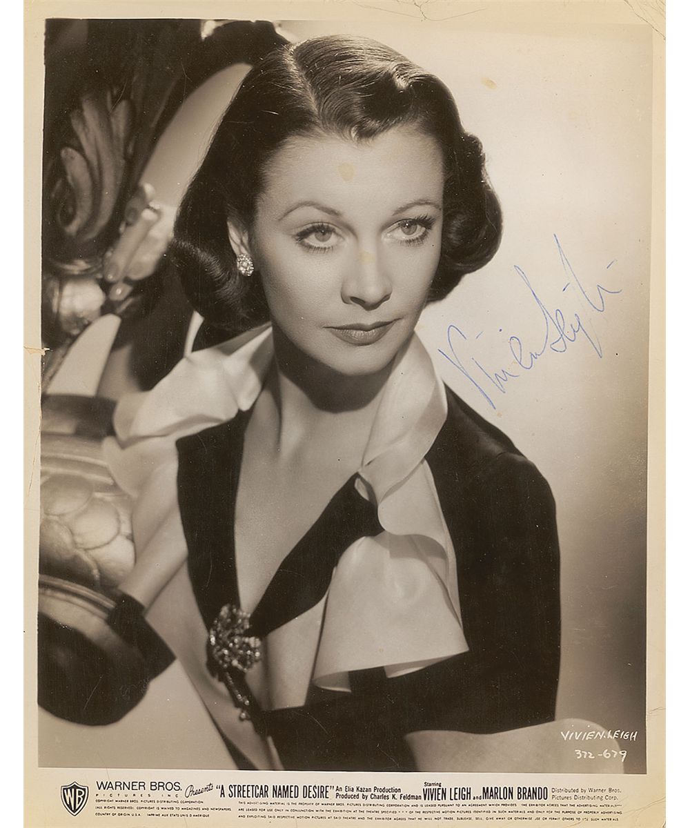 Vintage glossy 8 x 10 Warner Bros. promotional photo of Leigh for A Streetcar Named Desire, signed in blue ballpoint. In very good condition, with a few small repaired edge tears,and scattered creases, mainly to edges and corners.