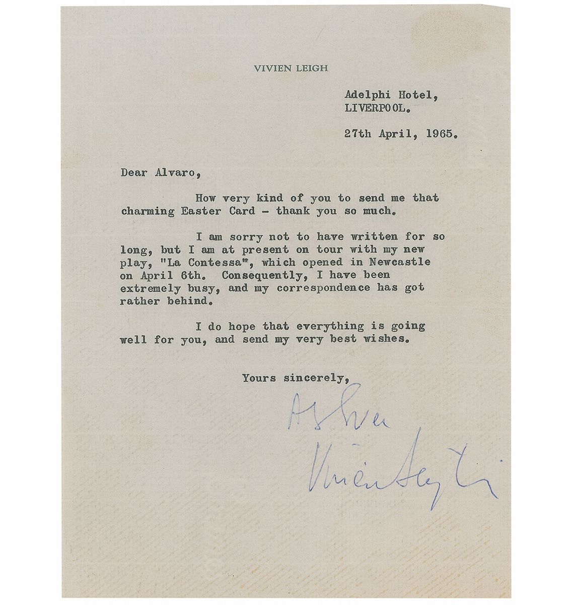 TLS signed “As ever, Vivien Leigh,” one page, 5.75 x 7.5, personal letterhead, April 27, 1965. Letter to Alvaro de la Torre. In part: “I am sorry not to have written for so long, but I am at present on tour with my new play, ‘La Contessa,’ which opened in Newcastle on April 6th. Consequently, I have been extremely busy, and my correspondence has got rather behind.” In fine condition, with small spot to top right corner and light lines of toning from previous storage in a magnetic photo album. Accompanied by the original mailing envelope.