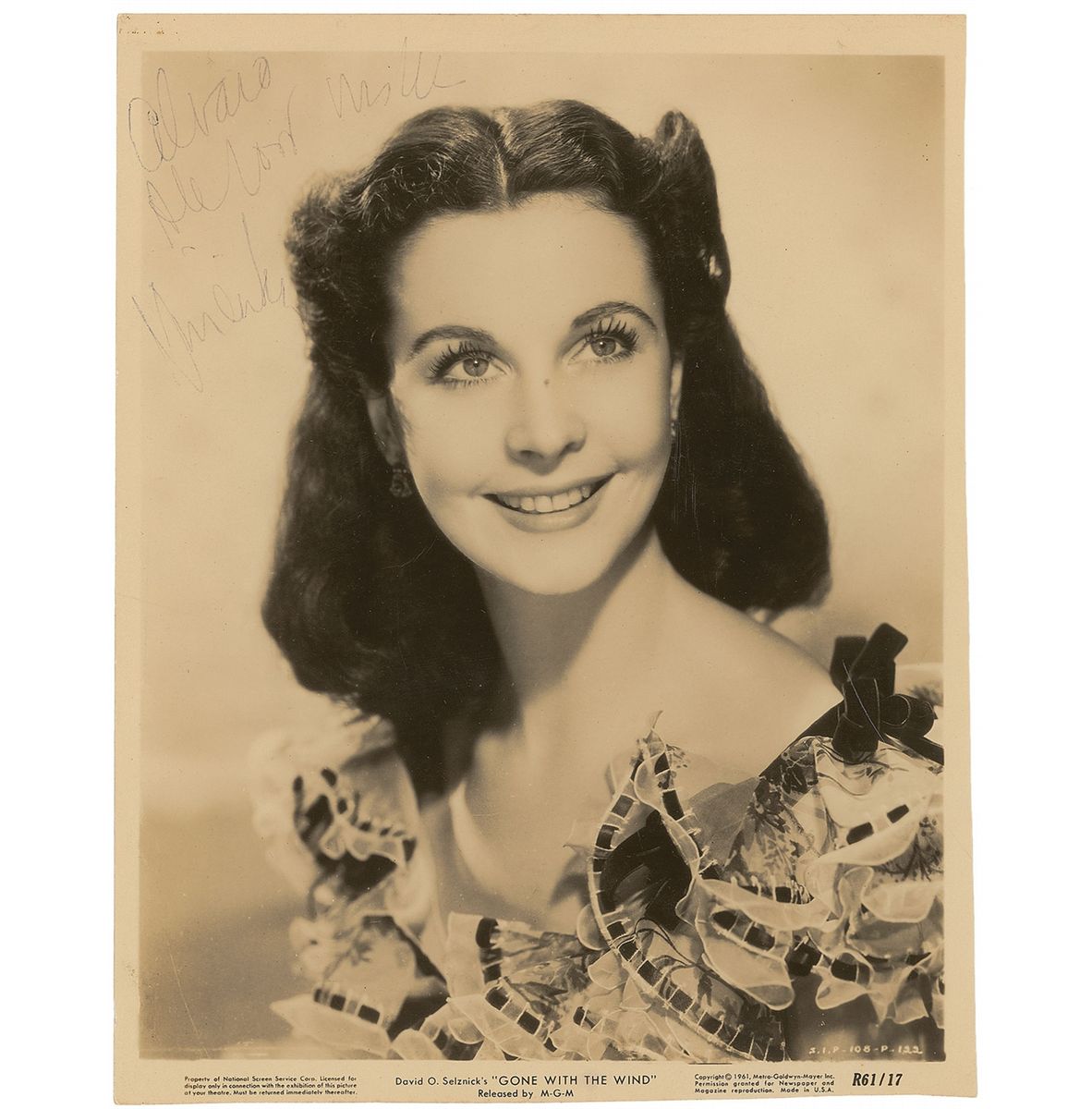 Vintage glossy 7.75 x 9.75 MGM promotional photo of Leigh as Scarlett O’Hara in Gone With the Wind, signed and inscribed in black ballpoint, “Alvaro, All good wishes, Vivien Leigh.” In very good condition, with a slightly trimmed bottom edge, scattered light surface creases, and signature and inscription a shade or two light due to decreased ink flow. A lovely image of Leigh’s first Academy Award-winning role, and an infrequently seen pose.