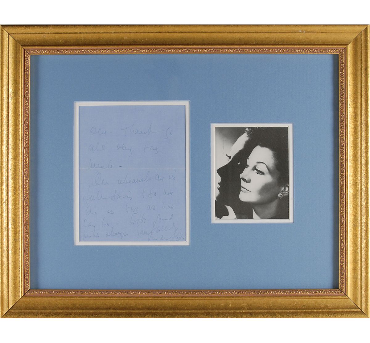 ALS, one page both sides, 5.25 x 6.5, personal letterhead, March 30, 1951. Letter to Iris Stanley, the president of her fan club. In full: “How very sweet and thoughtful of you all to send me an Easter present—and such a lovely one. Thank you all very much—Our rehearsals are in full swing and so we are as busy as we can be.” Nicely double-matted and framed beside a portrait to an overall size of 18 x 15, with a window in the backing for viewing of the front of the letter. In fine condition, with a bit of light contrast of the blue ink against the blue paper.