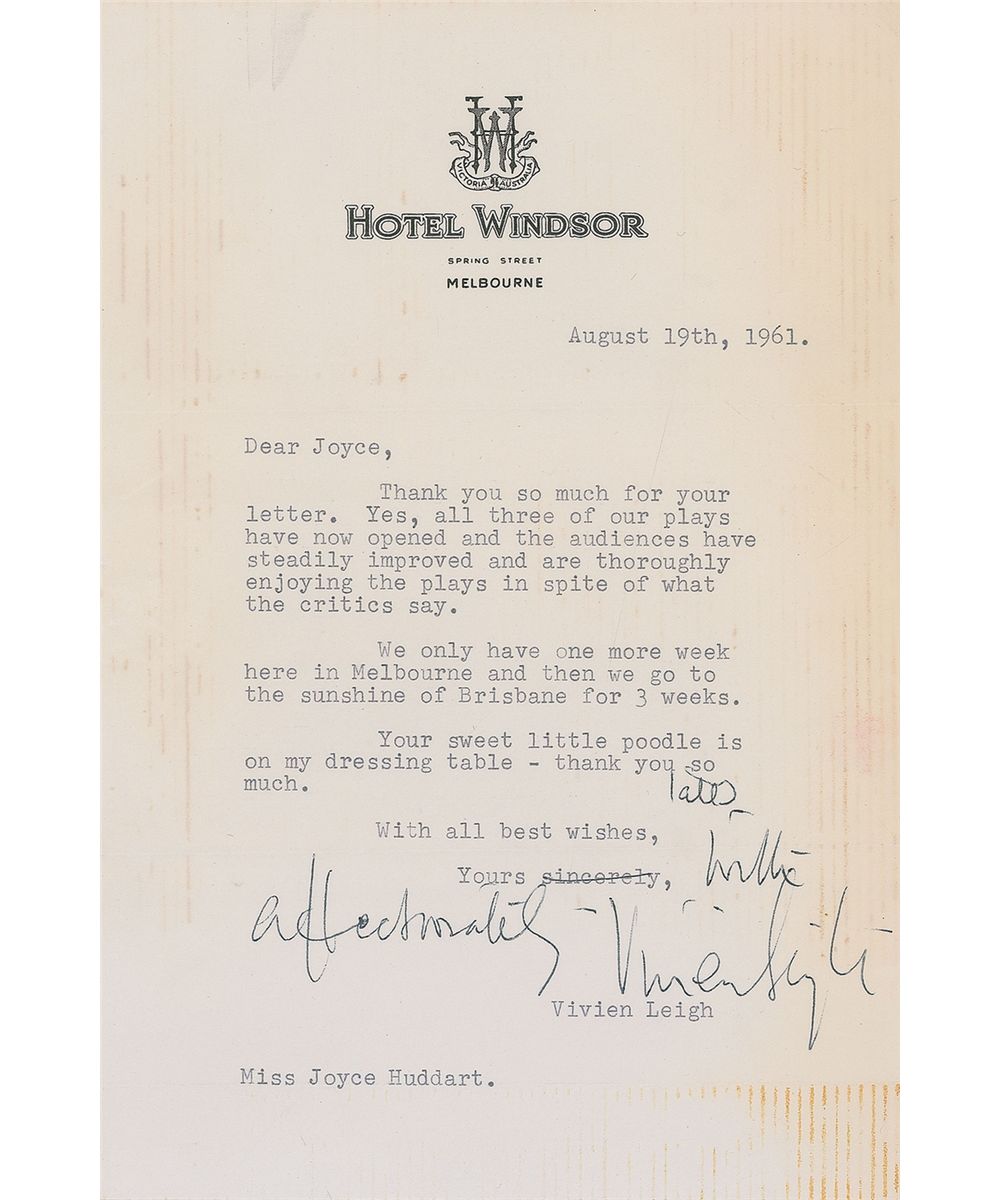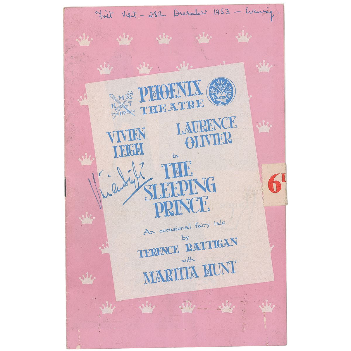 Two items: a program for a performance of The Sleeping Prince at the Phoenix Theatre, 5.25 x 8.25, bearing a collector’s date notation of December 28, 1953, signed in fountain pen on the front cover by Leigh; and a TLS, one page, Hotel Windsor letterhead, August 19, 1961, in part: “All three of our plays have now opened and the audiences have steadily improved and are thoroughly enjoying the plays in spite of what the critics say. We only have one more week here in Melbourne and then we go to the sunshine of Brisbane for 3 weeks.” Leigh adds a few handwritten words at the closing. Separations to the spine of the program and lines of toning to the letter, otherwise overall fine condition.