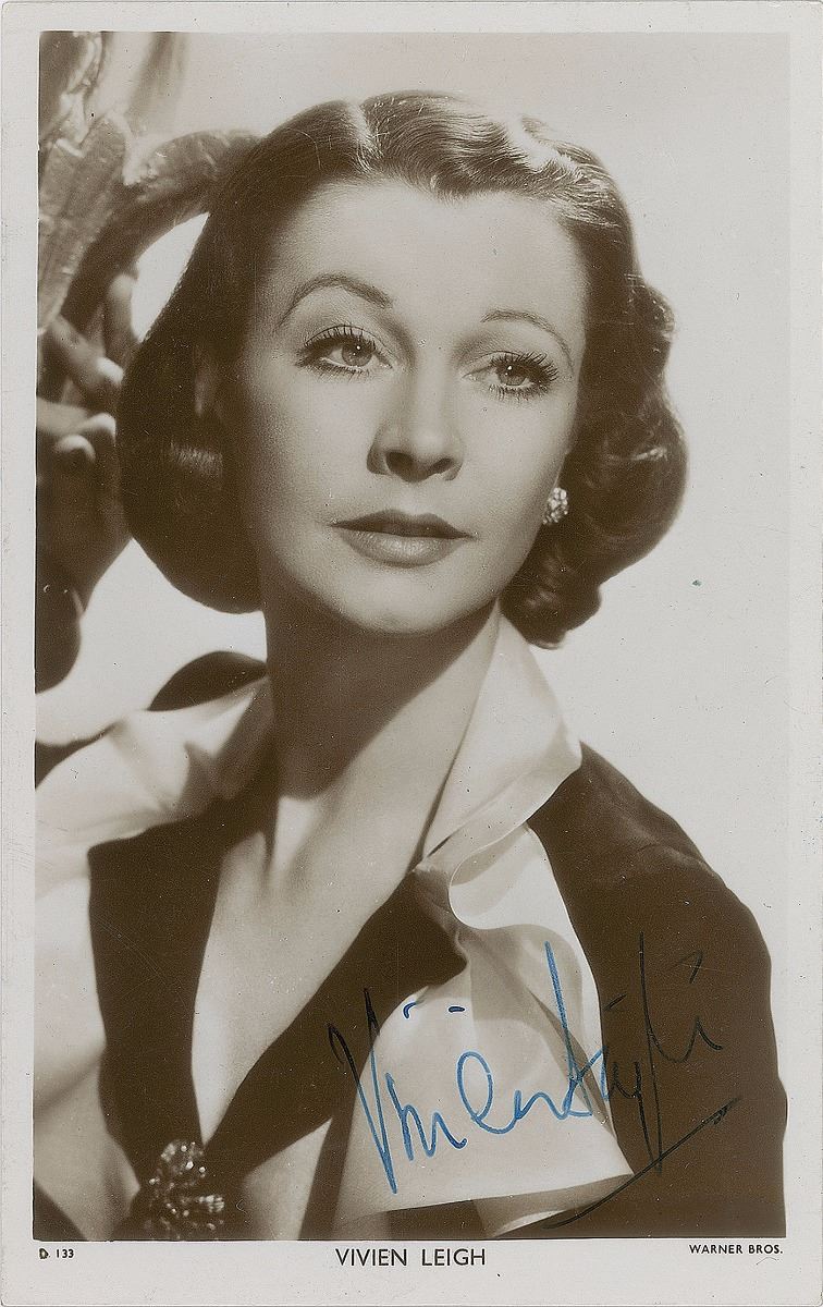 Vintage glossy 3.5 x 5.5 Warner Bros. postcard photo of Leigh in a glamorous pose, signed in blue fountain pen. In fine condition, with a light circular postal impression to a blank area.