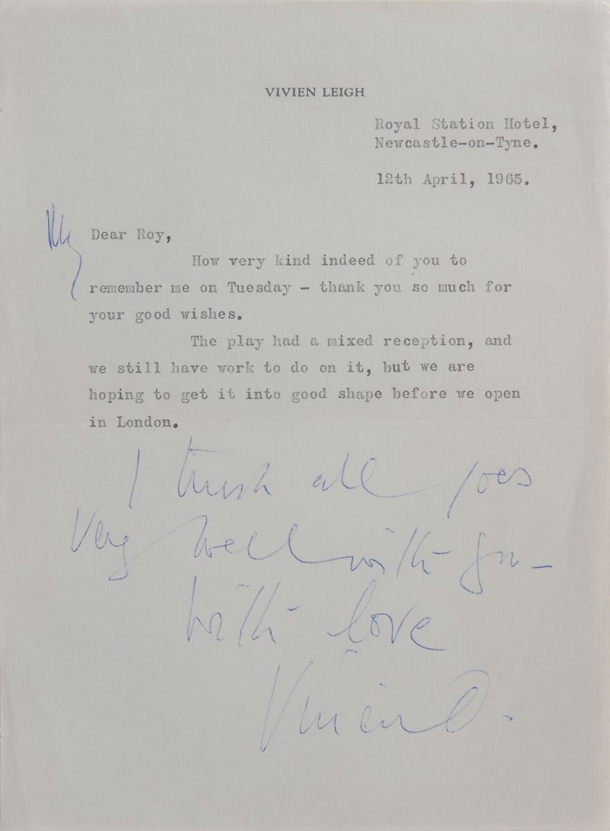 TLS signed “Vivien O,” one page, 5.75 x 7.75, personal letterhead, April 12, 1965. Letter to author Roy Moseley, in part: “The play had a mixed reception, and we still have work to do on it, but we are hoping to get it into good shape before we open in London.” She adds a handwritten postscript, “I trust all goes very well with you.” In fine condition. An uncommon signature from Leigh, who writes her last initial “O” for ‘Olivier.’