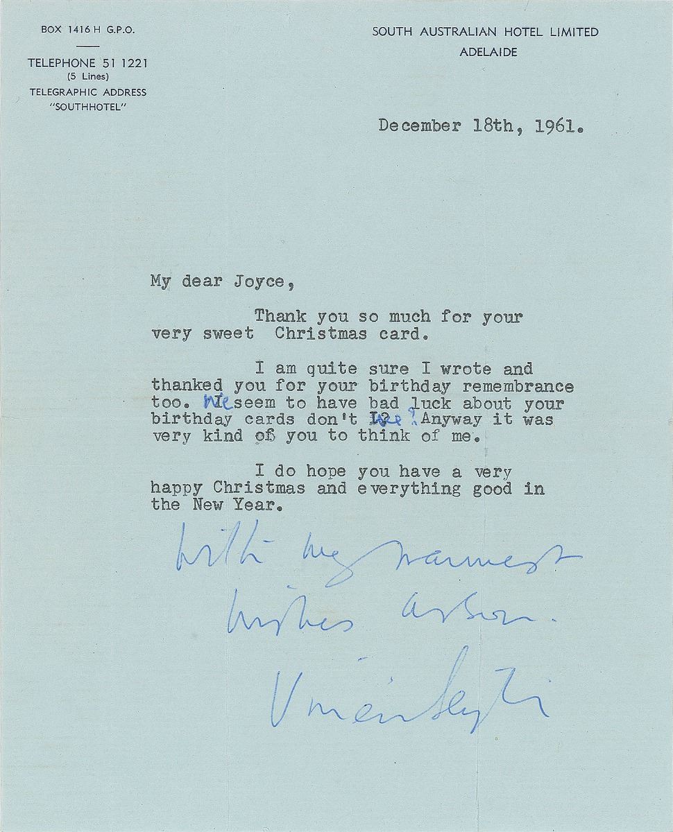 TLS, one page, 6.5 x 8, South Australian Hotel Limited letterhead, December 18, 1961. Letter to Joyce, in full: "Thank you so much for your very sweet Christmas card. I am quite sure I wrote and thanked you for your birthday remembrance too. We seem to have bad luck about your birthday cards don't we? Anyway it was very kind of you to think of me. I do hope you have a very happy Christmas and everything good in the New Year." Leigh adds the valediction and makes two emendations to the text in her own hand. In very good condition, with scattered light overall creasing and old mounting traces on the reverse.