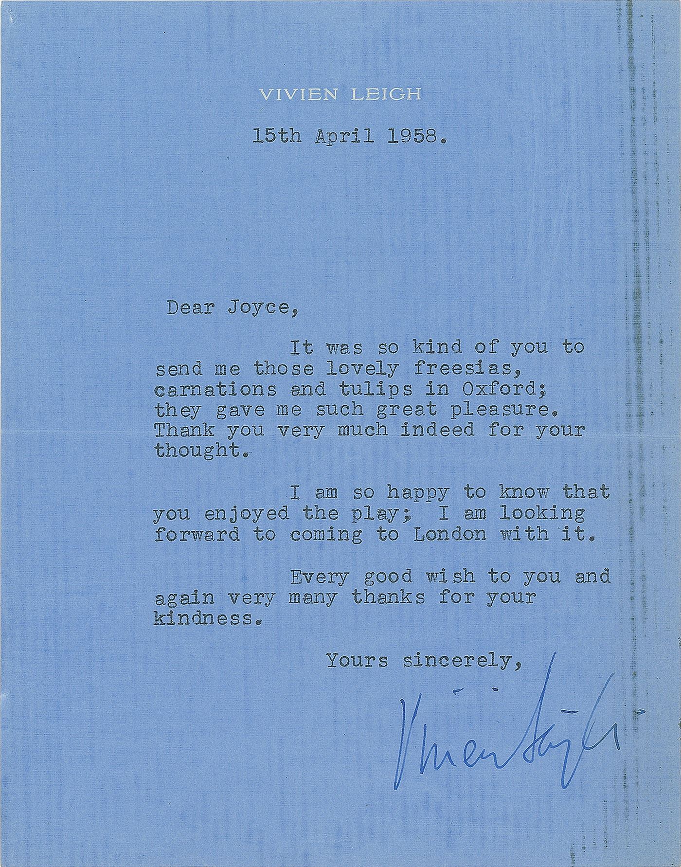 TLS, one page, 5.5 x 7, personal letterhead, April 15, 1958. Letter to her close friend Joyce Huddart, in full: "It was so kind of you to send me those lovely freesias, carnations and tulips in Oxford; they gave me such great pleasure. Thank you very much indeed for your thought. I am so happy to know that you enjoyed the play; I am looking forward to coming to London with it. Every good wish to you and again very many thanks for your kindness." In very good to fine condition, with light vertical stains from a magnetic photo album.