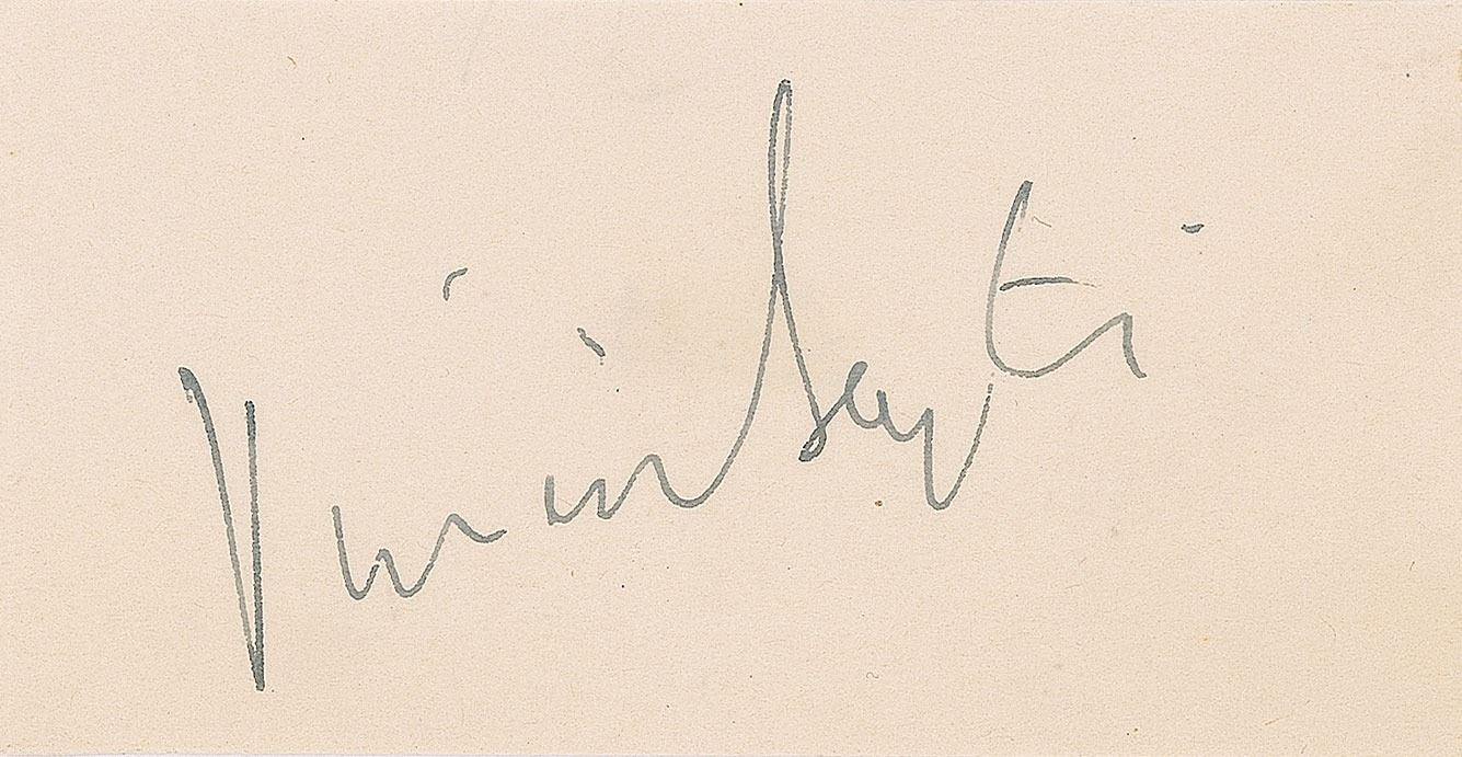 Vintage fountain pen signature, "Vivien Leigh,” on an off-white 3.75 x 2 sheet. In fine condition. Accompanied by a glossy photo postcard of Leigh.