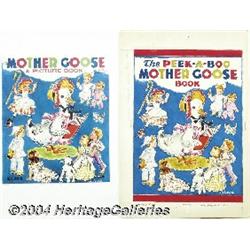 <B>Vivienne - The Peek-a-Boo Mother Goose Book Cover Original Art (Saalfield, undated).</B></I> Mama Goose reads her famous tales to a cadre of characters on this charming painted cover for a vintage picture book. A reprint of the book is also included in the lot. The art measures 12" x 17.5" and is in Excellent condition. 2 Coins <BR><BR><B>Important notice:</B> Heritage usually auctions material at the rate of 200-250 lots per hour. On some occasions eBay Live bid software or the Internet may not be able to keep up with the pace of the auction. We recommend placing a realistic absentee bid now as insurance to avoid disappointment. Occasionally the auctioneer may eliminate or reject an eBay Live bid, and the auctioneer may also reopen a lot after the close of the eBay live bidding (usually because we missed an audience bid), and may reject your bid even if it shows you as the winning bidder. By bidding via eBay Live, you agree that Heritage may award the lot to another bidder at its sole discretion under the circumstances described above or any other reasonable circumstances. Since eBay bids are not shown to us until we open the lot on the floor, we treat those bids just like floor bids. In most cases the floor responds before the eBay bid is presented to us, due to Internet lag time, so for consistency we have made it a policy that floor bids are always considered first over tie eBay live bids. Also please note that all Heritage lots purchased through eBay Live carry a 20% Buyer's Premium. Please make sure you read the Terms and Conditions before you bid.