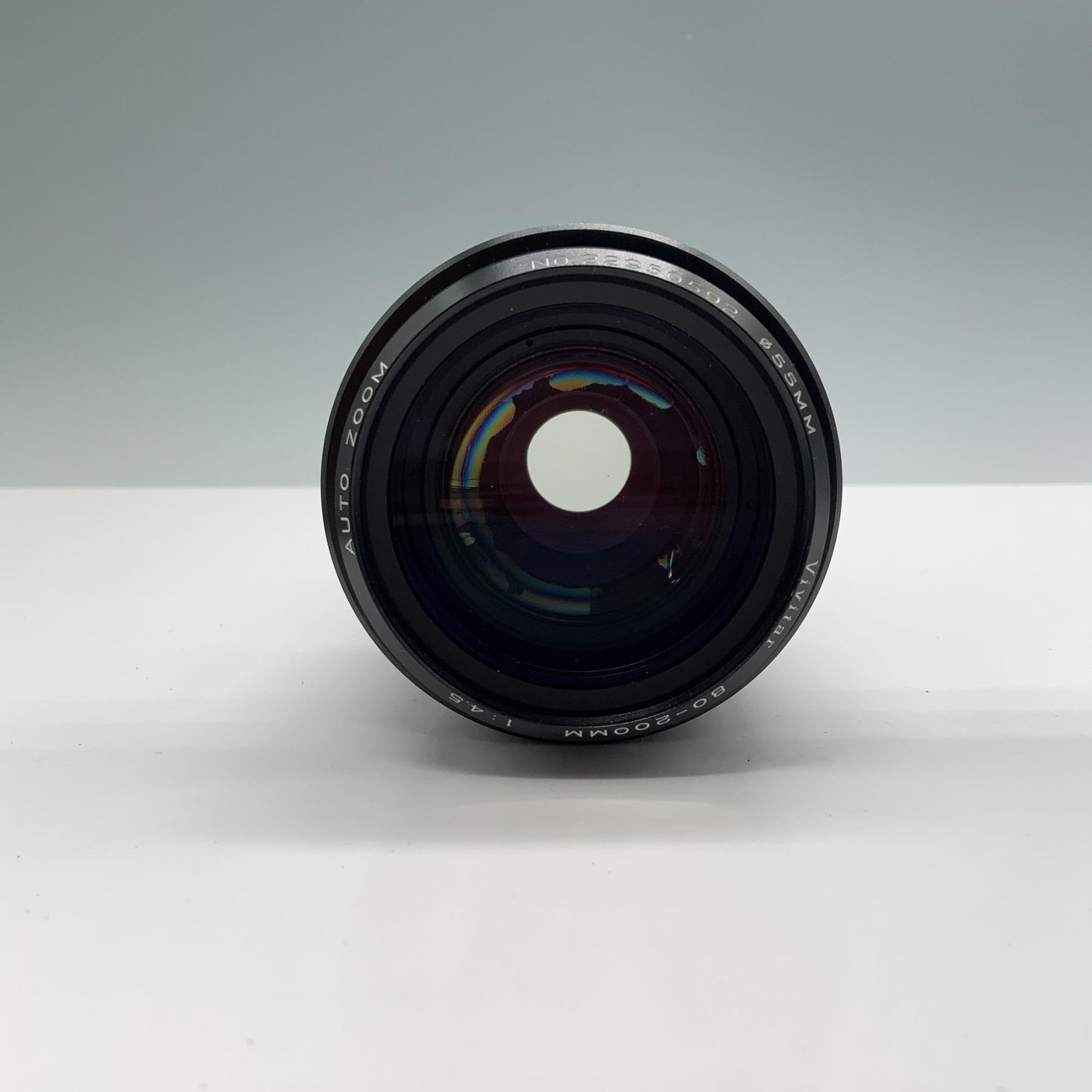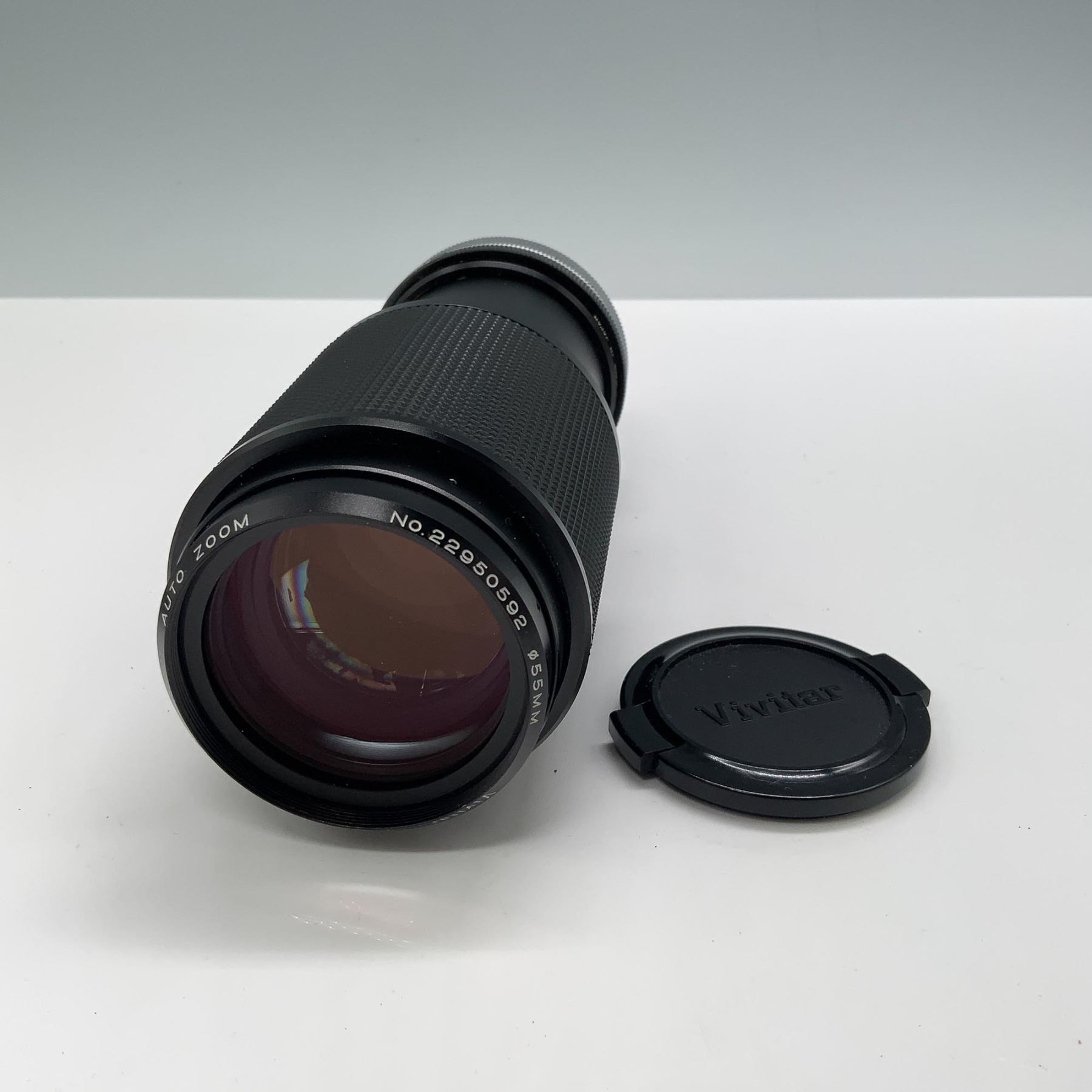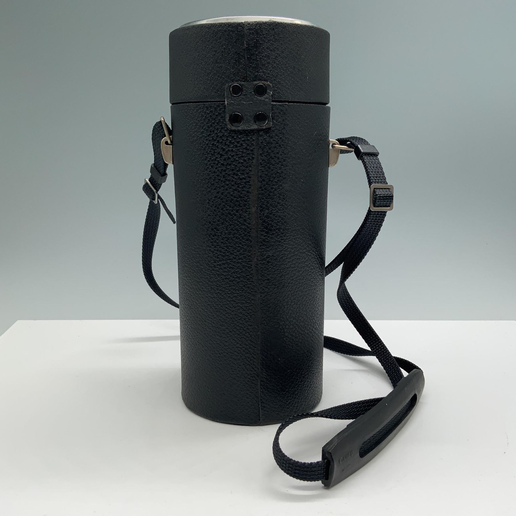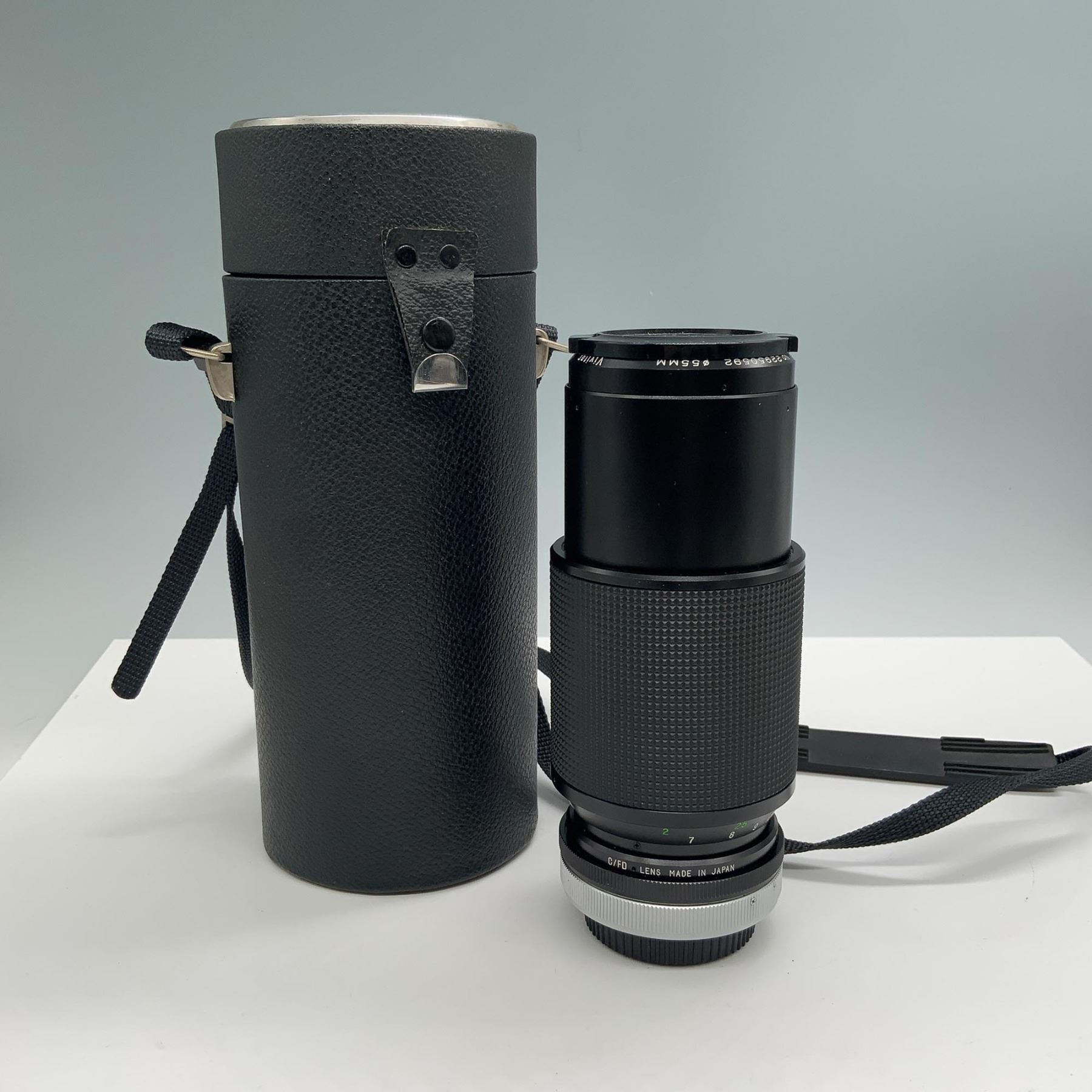 A Vivitar 80-200mm f/4.5 telephoto zoom lens with manual focus, featuring a sturdy build and a clean optical system. This lens includes two lens caps (front and rear) to protect its elements. It is housed in a durable black leatherette carrying case with a strap, ensuring safe transport and storage. The lens is a versatile accessory, ideal for capturing distant subjects with precision. Serial number visible: No. 220505092. This lot also includes the manufacturer's protective cap and original matching hard case. Can be usable with modern cameras with adaptor. Mount type : Canon FD