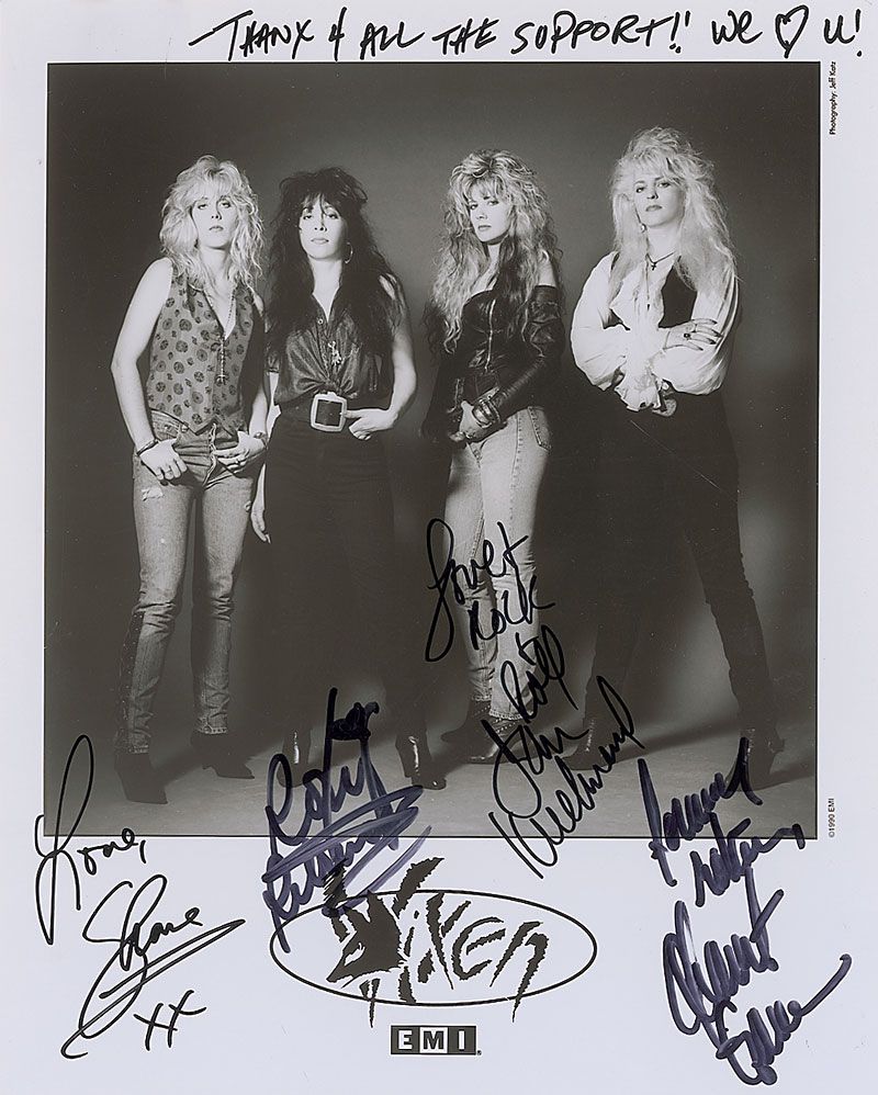 Glossy 8 x 10 EMI publicity photo of the band, signed in black felt tip by Janet Gardner, Jan Kuehnemund, Share Pedersen, and Roxy Petrucci, with each adding a brief sentiment. In fine condition.