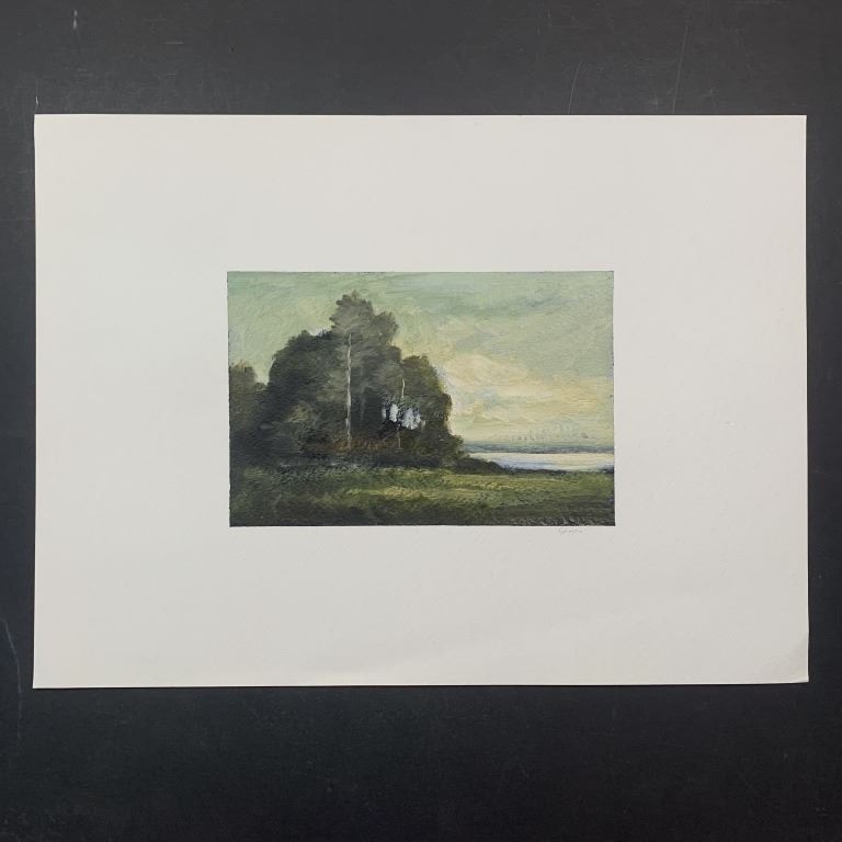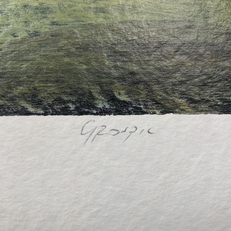 A Vlad Grospic original on paper, signed lower right. This piece is of a group of trees off in the distance, with a body of water in the background. This piece is in excellent condition.
