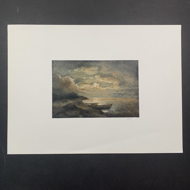 A Vlad Grospic original on paper, signed lower right. This piece is of a scene of two rowboats at the water's edge, during the evening against a dark sky. This piece is in excellent condition.