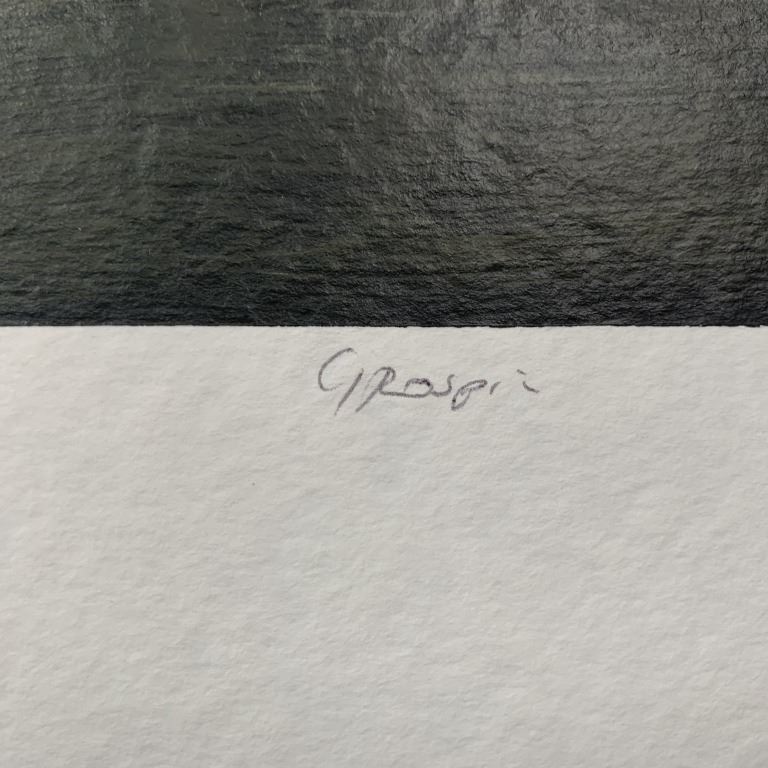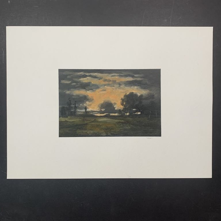 A Vlad Grospic original on paper, signed lower right. This piece is of a landscape scene with a green grassy field, with the sun setting in the distance. This piece is in excellent condition.
