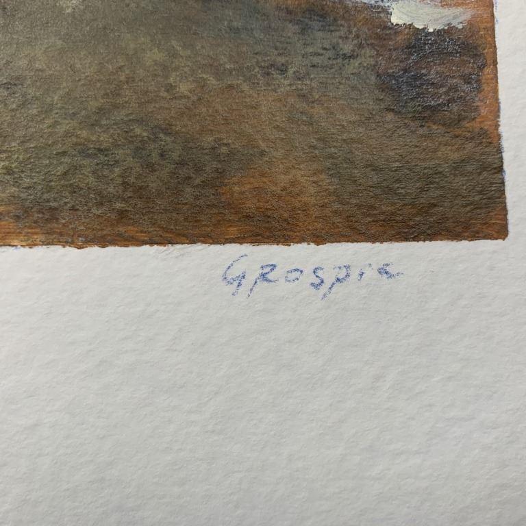 A Vlad Grospic original on paper, signed lower right. This piece is a scene of a few trees, with a body of water in the background. This piece is in excellent condition.