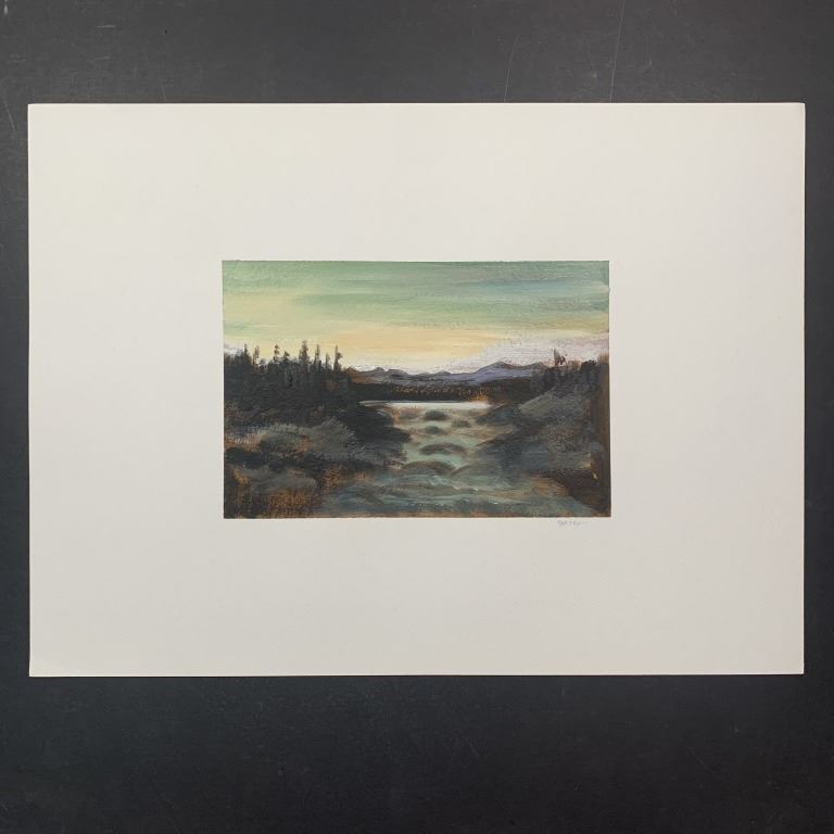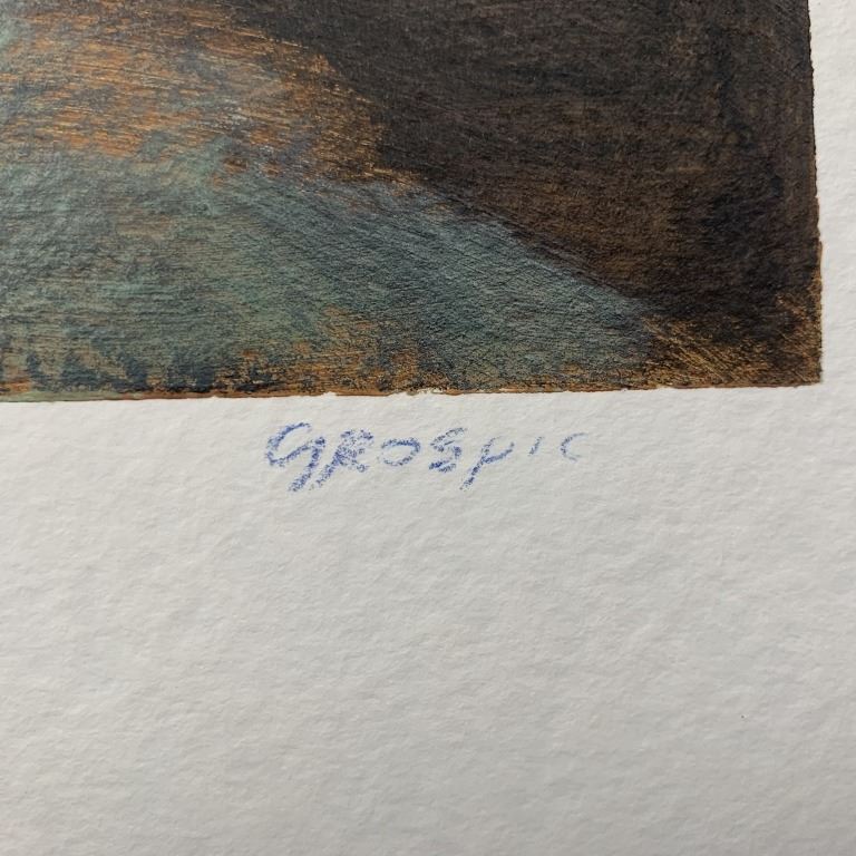 A Vlad Grospic original on paper, signed lower right. This piece is a scene of a small narrow stream in the foreground, with fields and trees on both sides. This piece is in excellent condition.
