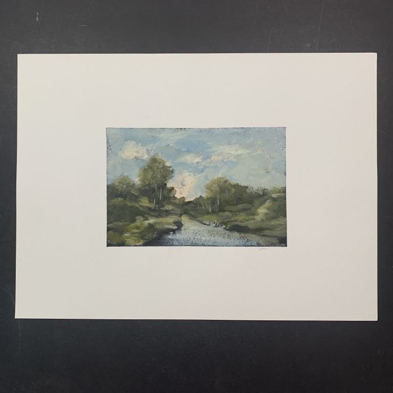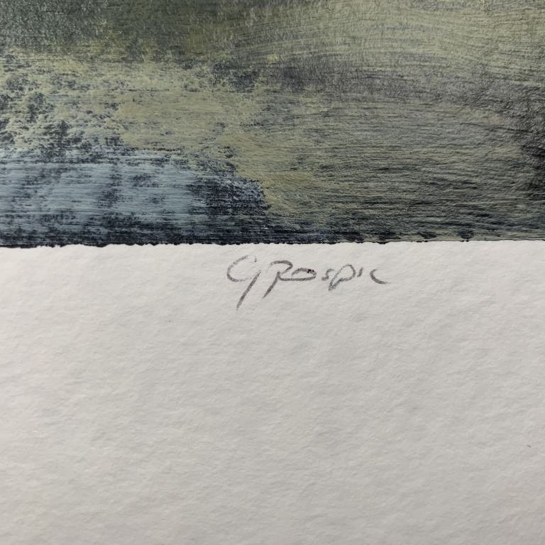 A Vlad Grospic original on paper, signed lower right. This piece is a scene of a small narrow stream in the foreground, with green grassy fields and trees on both sides. This piece is in excellent condition.