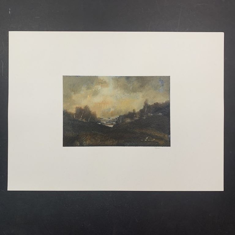 A Vlad Grospic original on paper, signed lower right. This piece is a landscape of a green field with trees in the background. This piece is in excellent condition.