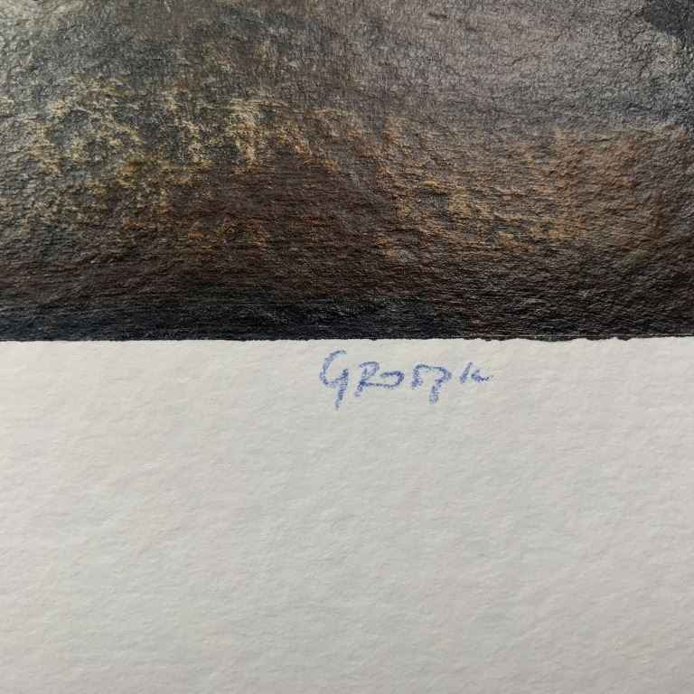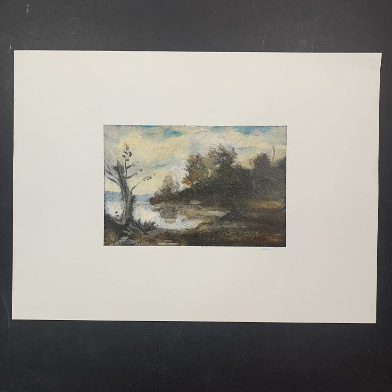 A Vlad Grospic original on paper, signed lower right. This piece is a scene of a small body of water, with a bare tree in the foreground, and trees in the background. This piece is in excellent condition.
