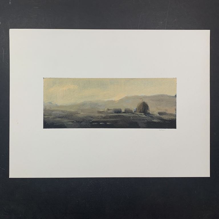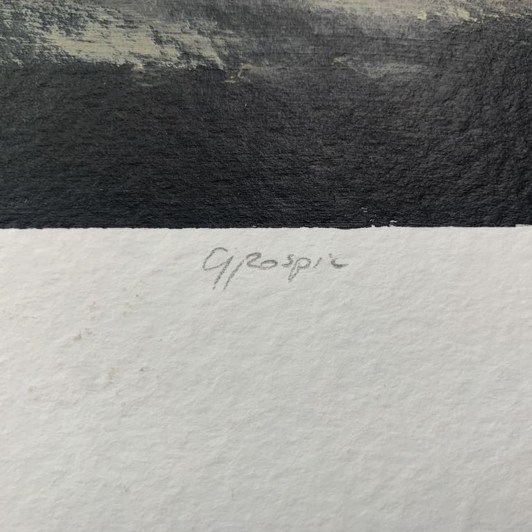A Vlad Grospic original on paper, signed lower right. This piece is a scene overlooking a communite with a domed building, and a mountainous terrain in the background. This piece is in excellent condition.