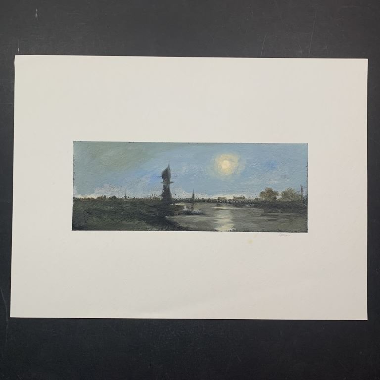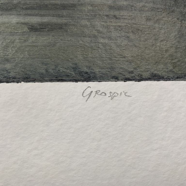 A Vlad Grospic original on paper, signed lower right. This piece is a scene looking out from the water's edge, with a grassy field at right, underneath a bright golden sun. This piece is in excellent condition with a very minor wrinkle upper left corner of paper.
