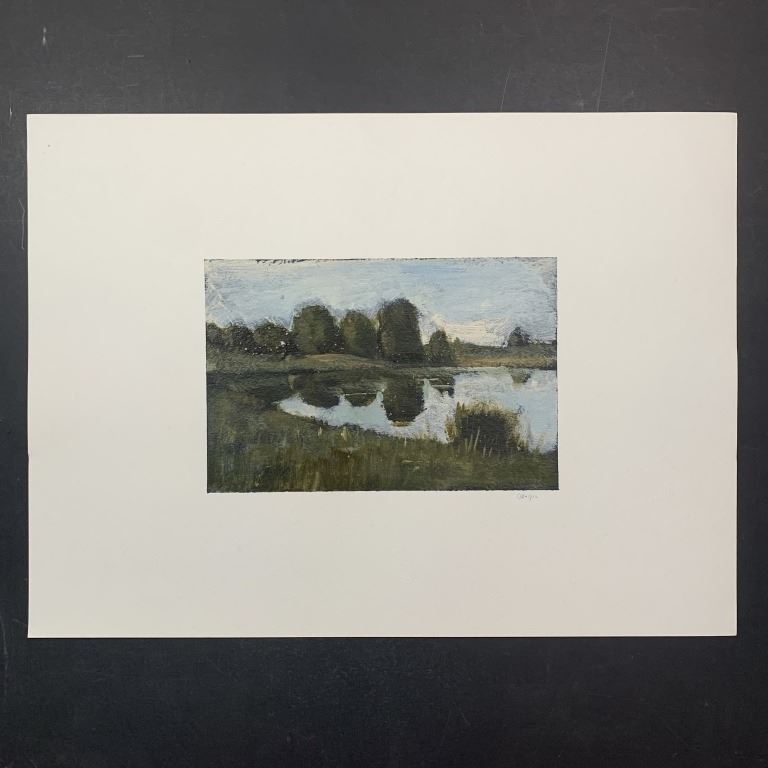 A Vlad Grospic original on paper, signed lower right. This piece is a scene of a small pond, surrounded by green grass, and large green trees in the background. This piece is in excellent condition.