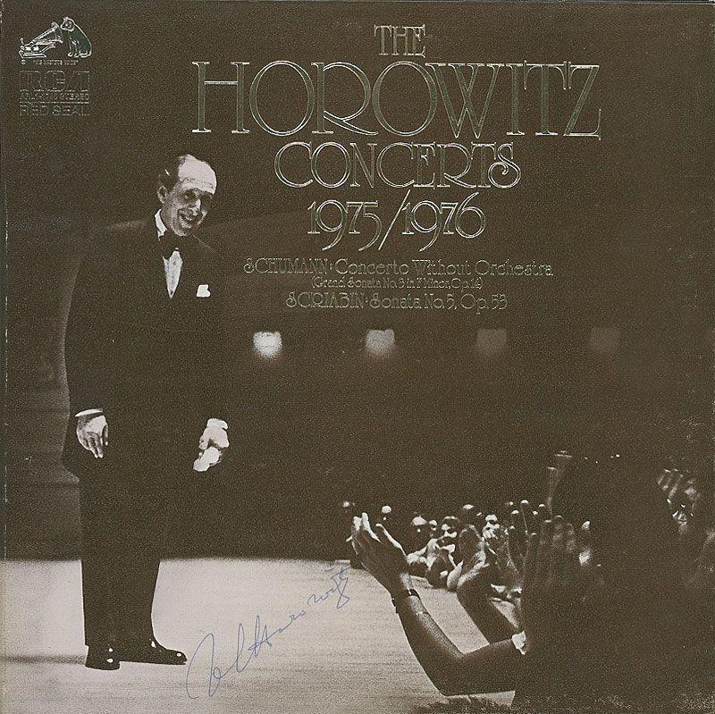 The Horowitz Concerts 1975/1976 Schumann—Concerto Without Orchestra (Sonata No. 3 Op. 14)—Scriabin—Sonata No. 5 album signed on the front cover in blue ink. In fine condition, with some light wear to back cover. The record is included.