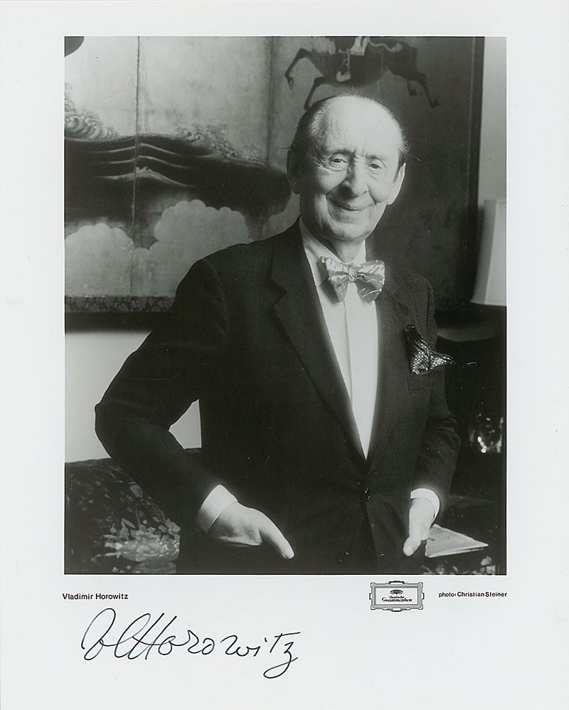 Glossy 8 x 10 publicity photo, signed in the lower border in black felt tip, “Vl. Horowitz.” In very fine condition.