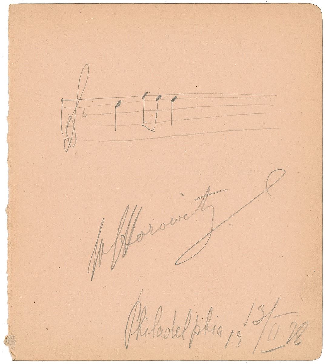 Sought-after AMQS in pencil on an off-white 6.25 x 7 album page. Horowitz pens one bar of music, signing below, “V. Horowitz, Philadelphia 13/II 78.” In fine condition. The first AMQS we have ever offered of the world-renowned pianist.
