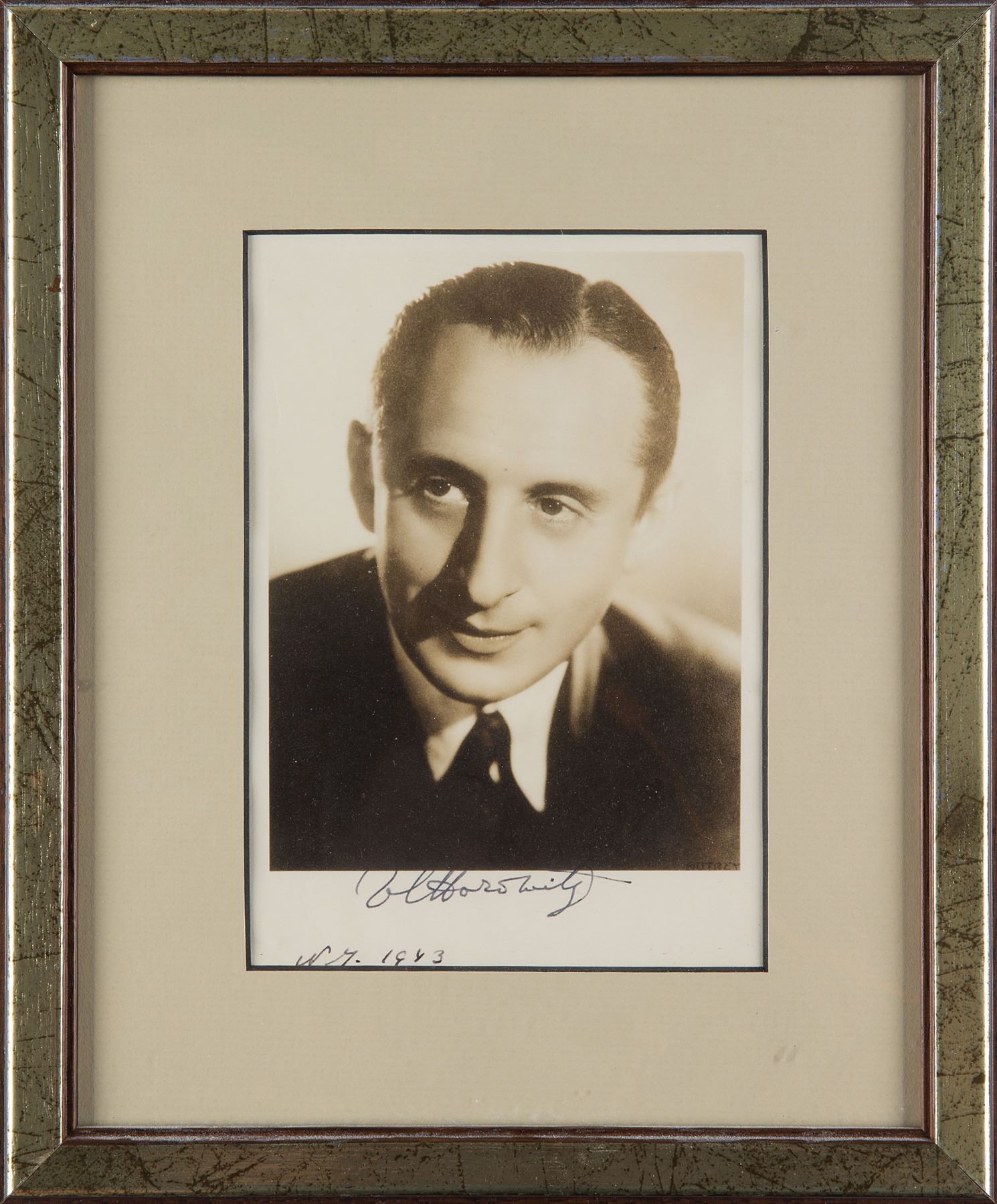 Scarce vintage matte-finish sepia 4.75 x 6.75 studio portrait of the Russian-born American classical pianist and composer in a handsome close-up pose, signed in the lower border in fountain pen, "V. Horowitz, N. Y. 1943." Matted and framed to an overall size of 9.25 x 11.25. In fine condition. A considerably early portrait of Horowitz, and the first signed photo we have offered in five years.
