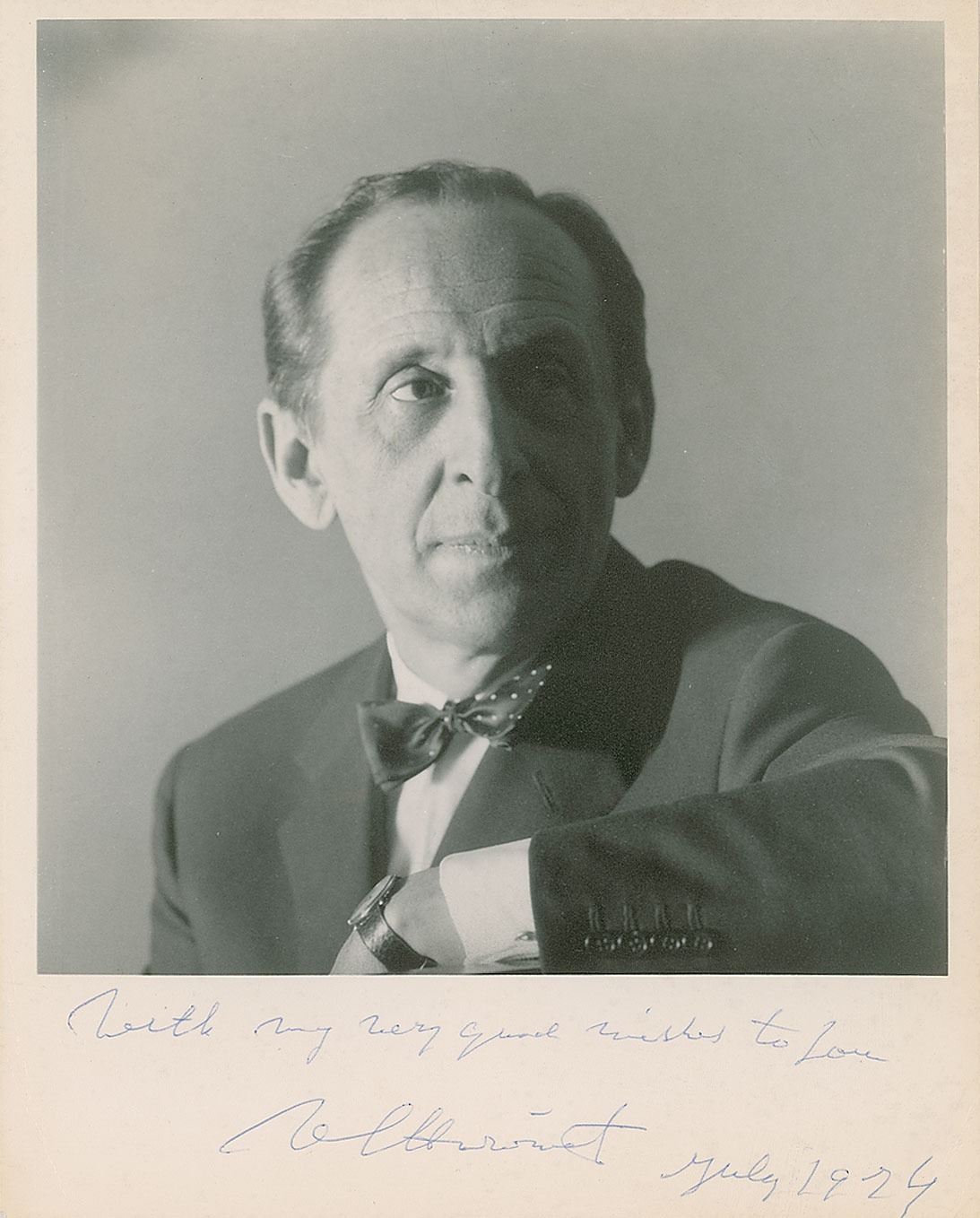 Matte-finish 8 x 10 photo of the pianist, signed in the lower border in blue ballpoint, "With my very good wishes to you, V. S. Horowitz, July 1974." In very good to fine condition, with creasing to the lower corners and center, touching Horowitz's left cheek.