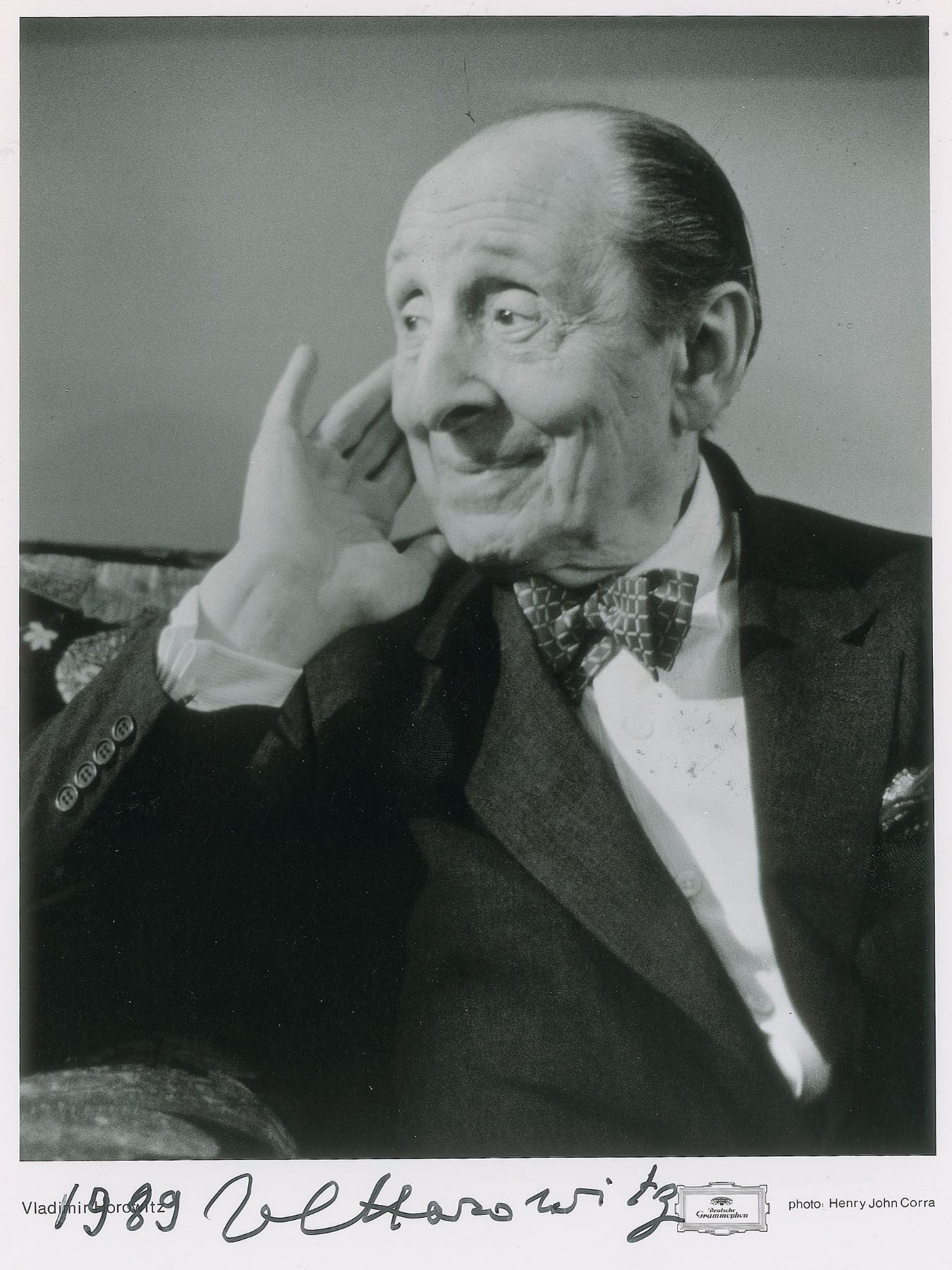 Glossy 7 x 9.75 publicity photo of the pianist, signed in the lower border in black felt tip, "1989, Vl. Horowitz." In fine condition, with several fingerprint impressions, visible at an angle.