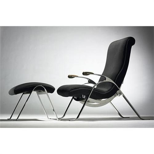 Vladimir Kagan<BR>Multi-position Contour chair and ottoman<BR>Vladimir Kagan Designs, Inc.<BR>USA, 1958<BR>stainless steel, upholstery, walnut<BR>25.5 w x 40.5 d x 36 h inches<BR>Ottoman measures: 20 w x 23 d x 17 h inches<BR>Literature: <BR><i>The Complete Kagan: A Lifetime of Avant-Garde Design</i>, Kagan, pg. 128<BR><BR>Condition of the item is not included in this description. Condition reports are available from Wright upon request. Wright strongly recommends that you review a condition report for each item on which you plan to bid.