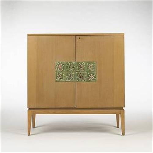 Vladimir Kagan custom dry bar Illi Kagan USA, c. 1948 oak, ceramic tile, mirror 42"w x 18.25"d x 44.25"h Features Warner Prins ceramic tiles. Two doors and a flip-top conceal a mirrored interior with three shelves and two lights. <BR>Provenance: Florence Swaybill, New York