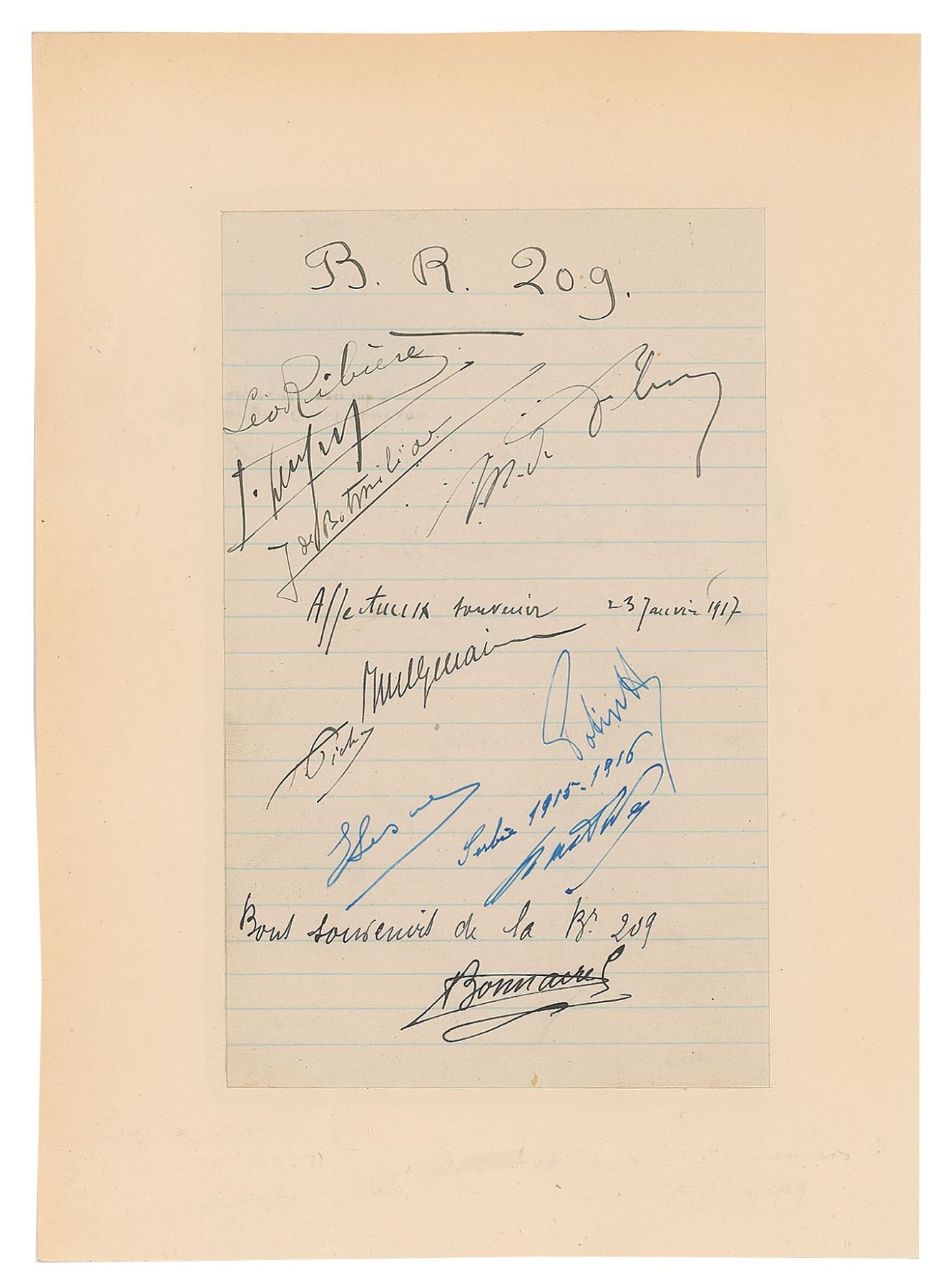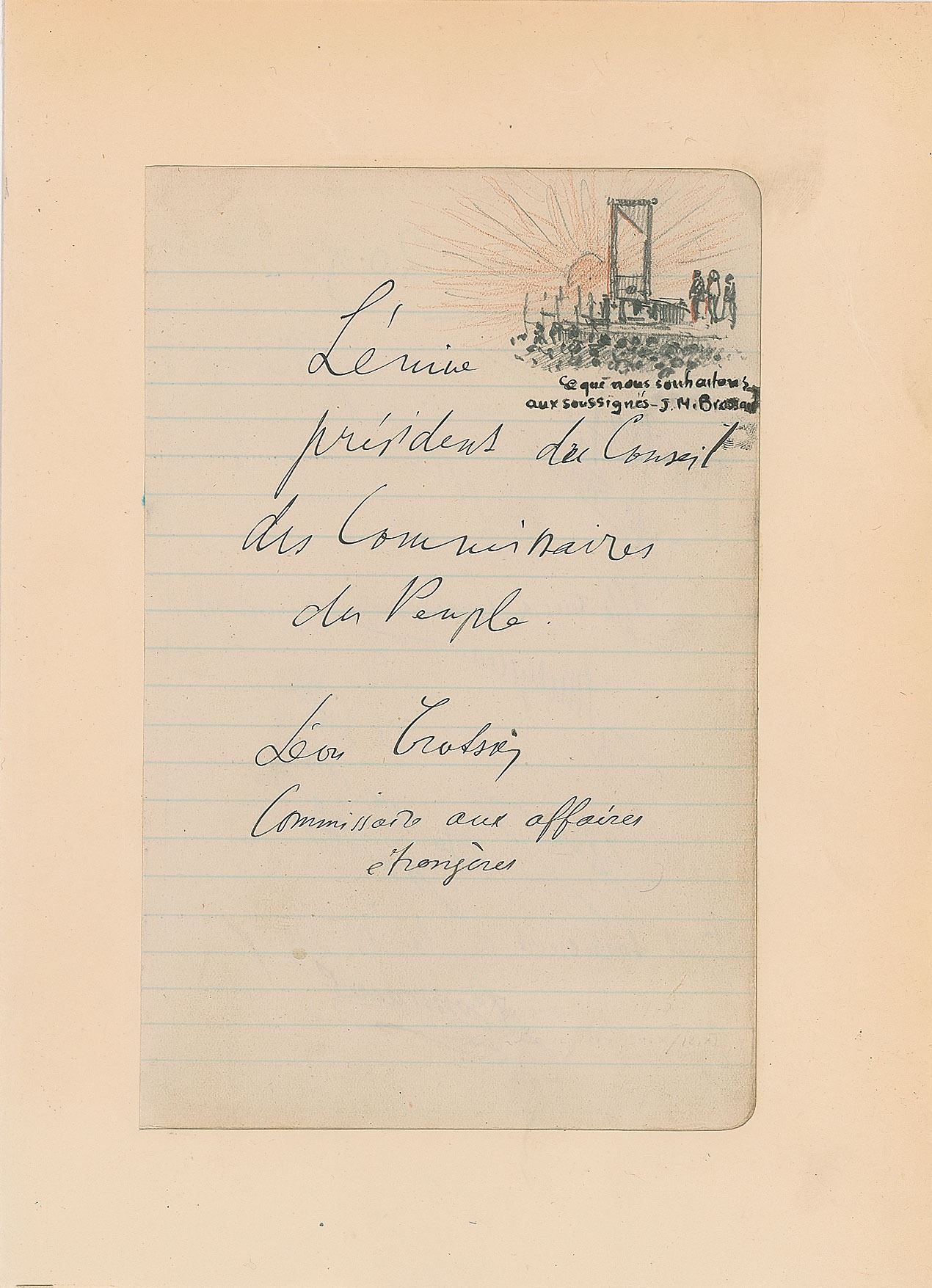 Amazingly rare combination of circa 1918 fountain pen signatures in French of Russian revolutionaries Vladimir Lenin, "Lenine, president du Conseil des Commissaires du Peuple," and Leon Trotsky, "Leon Trotsky, Commissaire aux affaires etrangeres," on a lightly-lined 4.5. x 7 off-white sheet. The upper right corner features an original contemporary pencil and crayon sketch of a guillotine by painter J. M. Brossart, the image depicting several individuals standing in a row as they face execution, signed below in ink, "Ce que nous souhaitons aux soussignés [What we wish for the undersigned]—J. M. Brossart." The reverse bears ten ink signatures of various French fighter pilots of World War I, each of them members of the Escadrille BR 209 squadron, including Leon Ribiere. Neatly inlaid into a larger off-white sheet and in fine condition. In fine condition.
