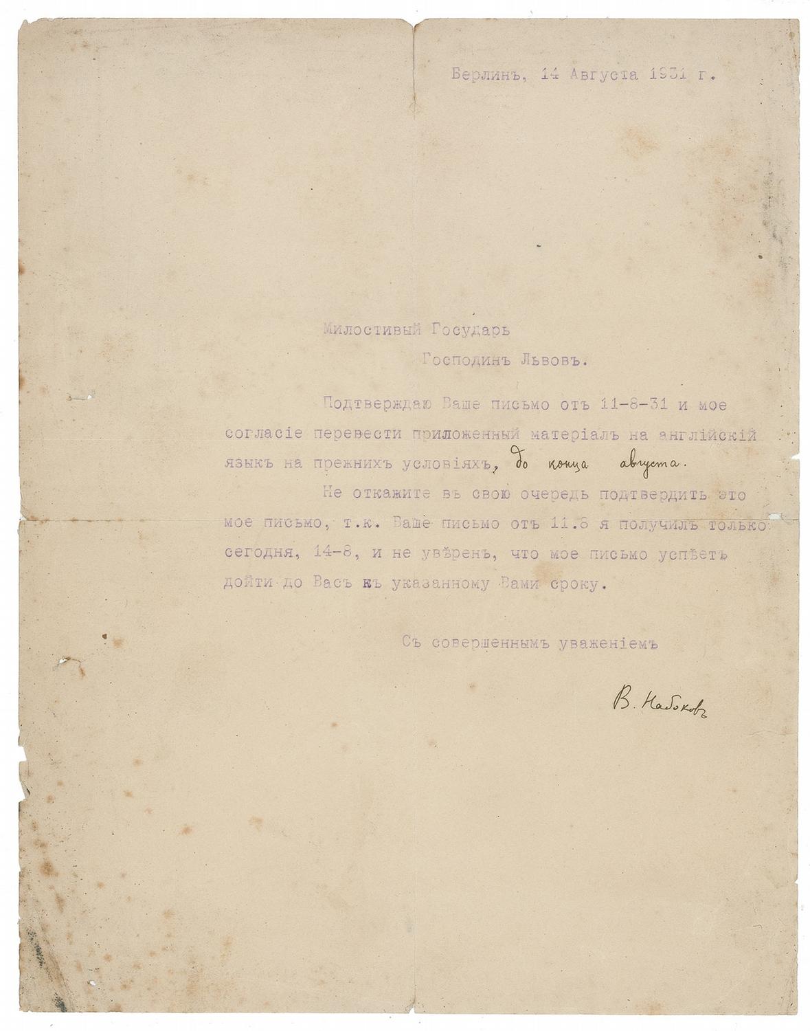 Much-esteemed Russian-born American writer (1899–1977), best known for the controversial 1955 classic Lolita, widely hailed as one of the greatest novels of the 20th century. TLS in Russian, signed “B. Habokob,” one page, 8.75 x 11, August 14, 1931. Letter to Mr. Lvov. In full (translated): “I acknowledge the receipt of your letter of August 11, 1931 and hereby give you my consent to translate the attached material into English, under the previously agreed-upon conditions, until the end of August. Please acknowledge the receipt of this letter, since I received your letter of August 11 only today, August 14, and I am not sure that you will receive my letter within the deadline set by you.” Nabokov has added three short words in his hand to the end of the first paragraph. In good to very good condition, with a few partial separations along central horizontal and vertical fold, scattered toning, foxing, and soiling, scattered edge tears, two holes to left side, and scattered creasing and wrinkling.