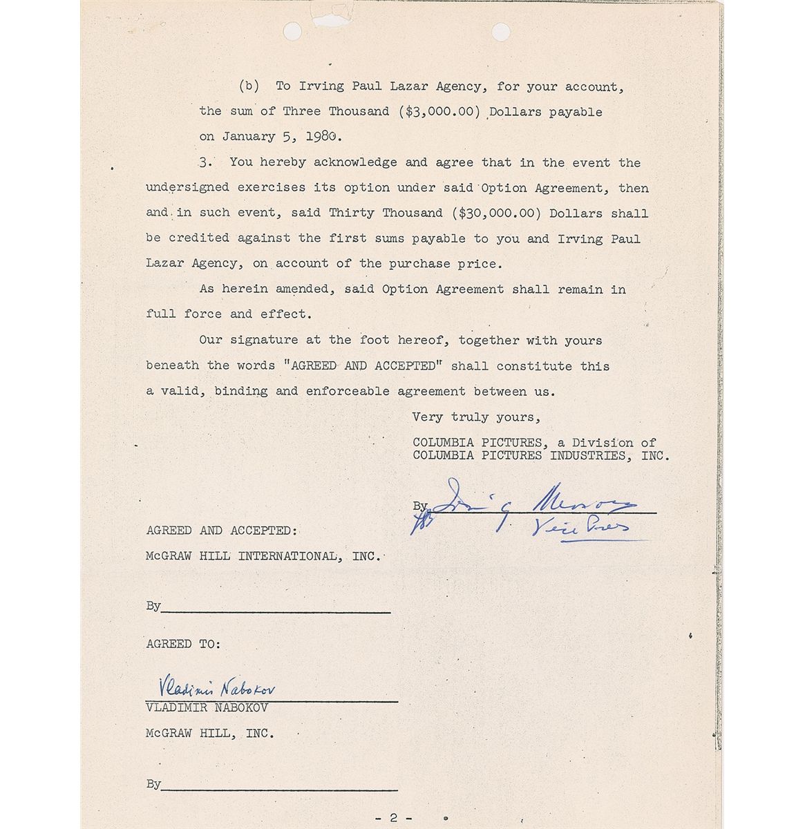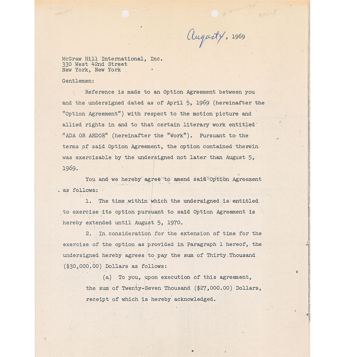 Very rare DS, two pages, 8.5 x 11, August 4, 1969. Document extending a deadline for an option agreement between Nabakov and McGraw Hill International “with respect to the motion picture and allied rights in and to that certain literary work entitled ‘Ada or Ardor.’” In fine condition, with punch and staple holes to the top. In 1969 Nabakov published Ada or Ardor: A Family Chronicle, his longest and arguably most difficult book, which he later referred to as his ‘most cosmopolitan and poetic novel.’ Noted scholar Alfred Appel also gave it high critical praise, writing that Ada 'provides further evidence that [Nabakov] is a peer of Kafka, Proust and Joyce.' Although Columbia Pictures would go on to pay half a million dollars for the film rights, the project never came to fruition. Nabakov is extremely rare in any form, and this piece is particularly desirable as it directly relates to one of his novels.