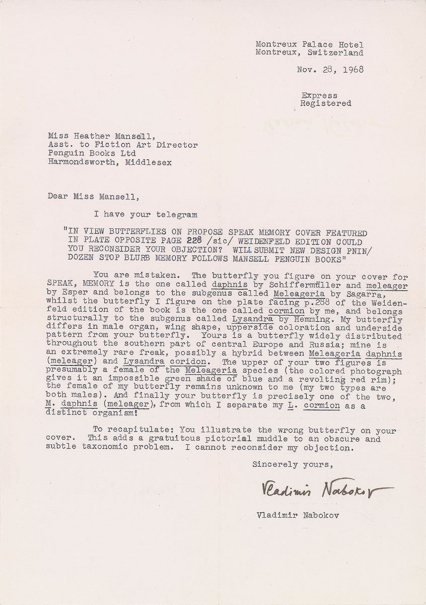 TLS, one page, 8.25 x 11.75, November 28, 1968. Written from the Montreux Palace Hotel, a letter to Heather Mansell of Penguin Books, Ltd., responding to her telegram, in part: "You are mistaken. The butterfly you figure on your cover for Speak, Memory is the one called daphnis by Schiffermuller and meleager by Esper belongs to the subgenus called Meleageria by Sagarra, whilst the butterfly I figure on the plate facing p.288 of the Weidenfeld edition of the book is the one called cormion by me, and belongs structurally to the subgenus called Lysandra by Hemming. My butterfly differs in male organ, wing shape, upperside coloration and underside pattern from your butterfly. Yours is a butterfly widely distributed throughout the southern part of central Europe and Russia; mine is an extremely rare freak, possibly a hybrid between Meleageria daphnis (meleager) and Lysandra coridon. The upper of your two figures is presumably a female of the Meleageria species (the colored photograph gives it an impossible green shade of blue and a revolting red rim); the female of my butterfly remains unknown to me (my two types are both males). And finally your butterfly is precisely one of the two, M. daphnis (meleager), from which I separate my L. cormion as a distinct organism! To recapitulate: You illustrate the wrong butterfly on your cover. This adds a gratuitous pictorial muddle to an obscure and subtle taxonomic problem. I cannot reconsider my objection." In fine condition. Accompanied by the original mailing envelope. For their annual summer vacation, Nabokov and his wife Vera roamed the pastoral and mountain reaches of the western United States looking for butterflies. As a passionate entomologist, in particular the study of lepidopterology, Nabokov studied the delicate creatures all his life, chasing them about while he wrote his classic Lolita, and then, as a research fellow in zoology, organizing the lepidoptera collection of the Museum of Comparative Zoology at Harvard University. The book Fines Lines reproduces a hundred and fifty-four of his magnificent illustrations of butterfly wings and genitalia.
