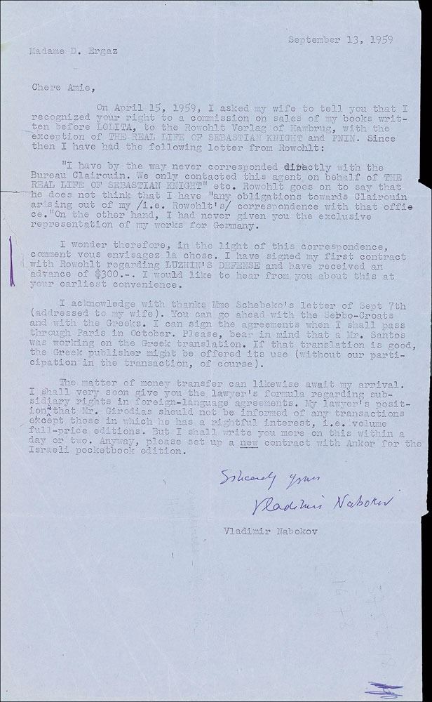 TLS signed “Sincerely yours, Vladimir Nabokov,” one page on a self-contained 7.25 x 12 aerogramme letter, September 13, 1959. Letter to his French literary agent, Madame D. Ergaz, in full: “On April 15, 1959, I asked my wife to tell you that I recognized your right to a commission on sales of my books written before Lolita, to the Rowohlt Verlag of Hamburg, with the exception of The Real Life of Sebastian Knight and Pnin. Since then I have had the following letter from Rowohlt: 'I have by the way never corresponded directly with the Bureau Clairouin. We only contacted this agent on behalf of The Real Life of Sebastian Knight' etc. Rowohlt goes on to say that he does not think that I have 'any obligations towards Clairouin arising out of my /i.e. Rowohlt's/ correspondence with that office.' On the other hand, I had never given you the exclusive representation of my works for Germany. I wonder therefore, in the light of this correspondence, comment vous envisagez la chose. I have signed my first contract with Rowohlt regarding Luzhin's Defense and received an advance of $300.—. I would like to hear from you about this at your earliest convenience. I acknowledge with thanks Mme Schebeko's letter of Sept 7th (addressed to my wife). You can go ahead with the Serbo-Croats and with the Greeks. I can sign the agreements when I shall pass through Paris in October. Please, bear in mind that a Mr. Santos was working on the Greek translation. If that translation is good, the Greek publisher might be offered its use (without our participation in the transaction, our course). The master of money transfer can likewise await my arrival. I shall very soon give you the lawyer’s formula regarding subsidiary rights in foreign-language agreements. My lawyer’s position is that Mr. Girodias should not be informed of any transactions except those in which he has a rightful interest, i.e. volume full-price editions. But I shall write you more on this within a day or two. Anyway, please set up a new contract with Ankor for the Israeli pocketbook edition.” In fine condition overall, with a few small marginal tears and pen marks, and light wrinkling. An interesting letter relating to the foreign publication of Nabokov’s greatest works, in particular Lolita, which earned its first American publication by G. P. Putnam's Sons in August 1958.