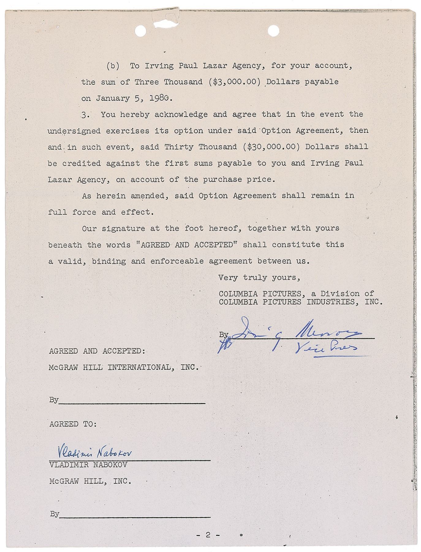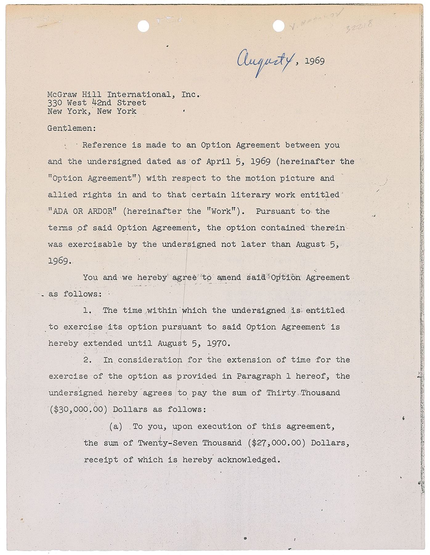 Rare DS, two pages, 8.5 x 11, August 4, 1969. Document extending a deadline for an option agreement between Nabokov and McGraw Hill International "with respect to the motion picture and allied rights in and to that certain literary work entitled 'Ada or Ardor.'" Signed at the conclusion by Nabokov, and countersigned by a representative of Columbia Pictures. In fine condition, with punch and staple holes to the top. In 1969 Nabokov published Ada or Ardor: A Family Chronicle, his longest and arguably most difficult book, which he later referred to as his 'most cosmopolitan and poetic novel.' Noted scholar Alfred Appel also gave it high critical praise, writing that Ada 'provides further evidence that [Nabokov] is a peer of Kafka, Proust and Joyce.' Although Columbia Pictures would go on to pay half a million dollars for the film rights, the project never came to fruition. Nabokov is very rare in any form, and this piece is particularly desirable as it directly relates to one of his novels.