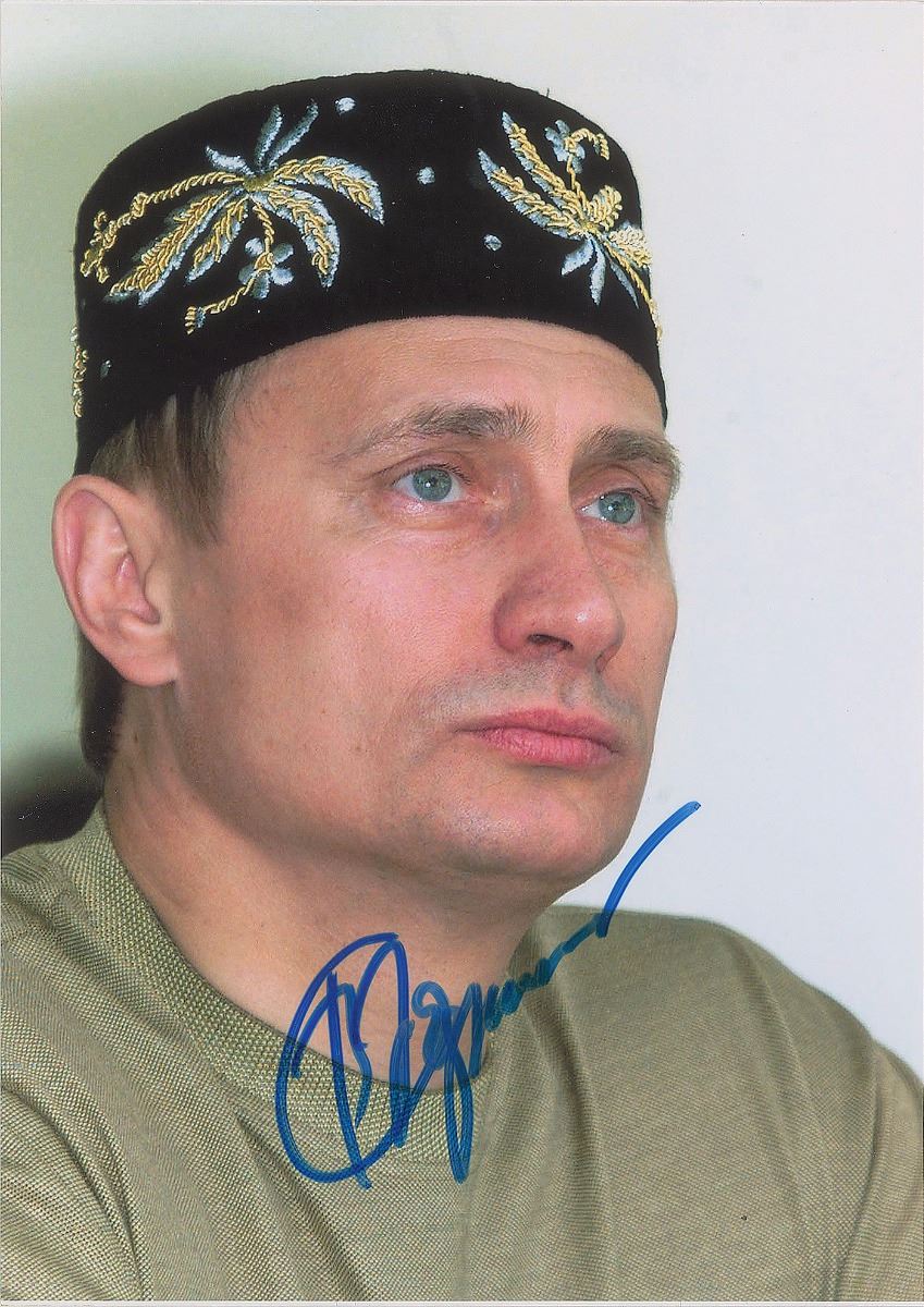Uncommon color glossy 5 x 7 close-up photo of Vladimir Putin, signed in blue felt tip. In fine condition.