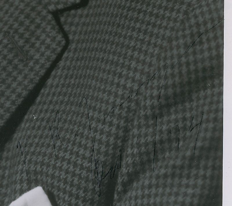 Russian-American engineer and inventor of the iconoscope and kinoscope that, together, constituted the first all-electronic television system (1888–1982). Uncommon glossy 8 x 10 portrait of Zworykin, signed in the lower right in ballpoint, “V. K. Zworykin, Oct. 1/74.” In very good condition, with a crease to the upper left and very poor contrast to signature against the checkered pattern of his suit.