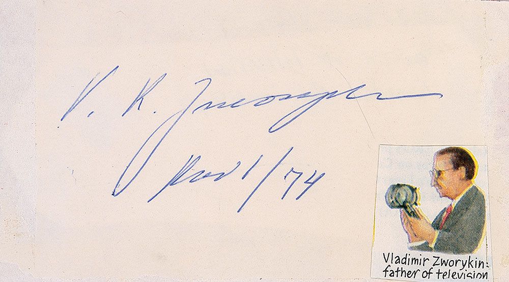 Inventor (1888–1982) and pioneer of television technology. Ballpoint signature, “V. K. Zworykin, Nov 1/74,” on an off-white 4.75 x 2.5 slip, with a small clipped caricature affixed to the lower right. Slip is affixed to an identical size piece of red cardstock. In fine condition, with surface loss around edges.