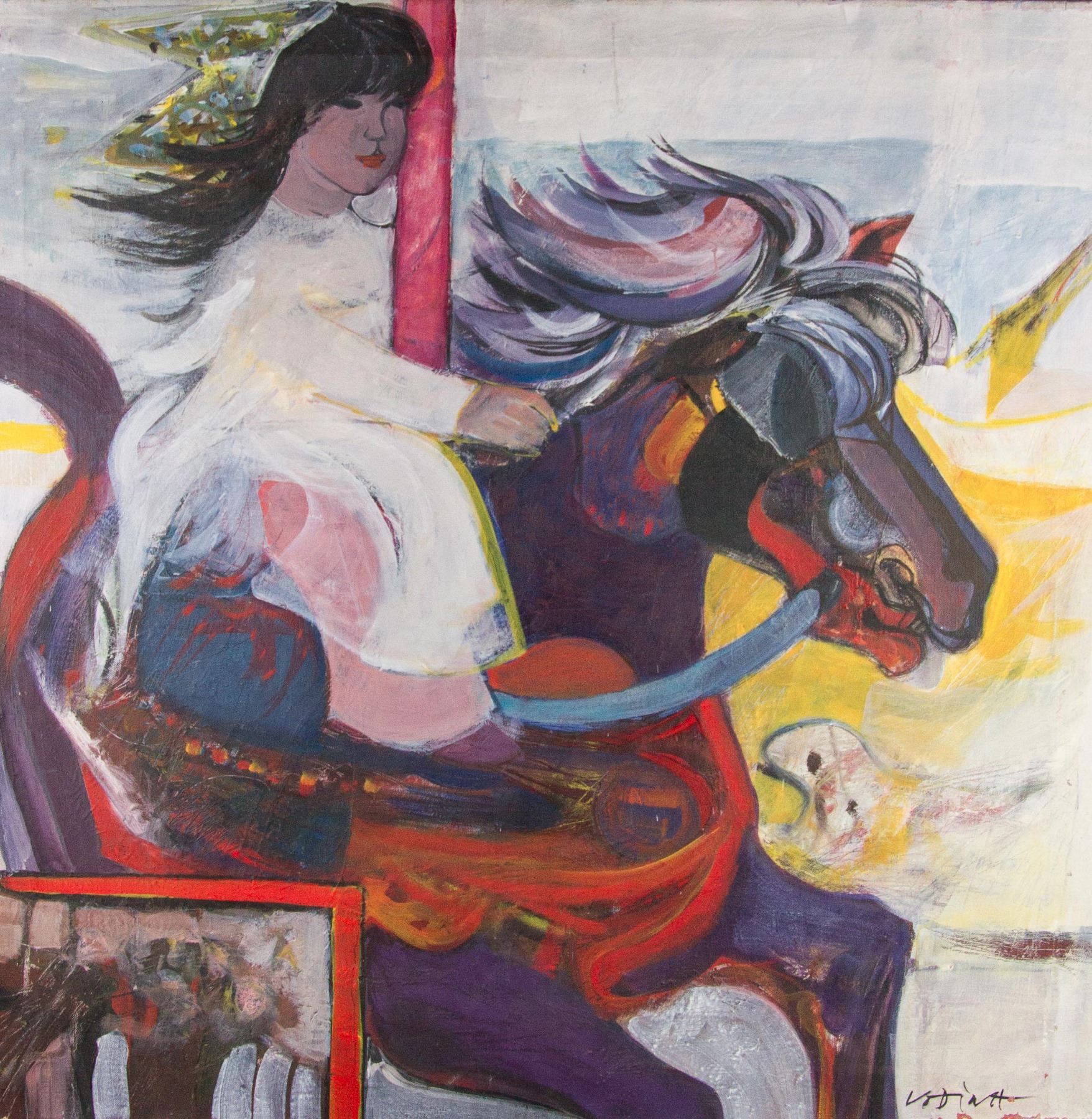 Girl on carousel; oil on canvas; mounted on board; signed Vo Dinh Mai (1933-2009), Vietnamese artist; 78 cm x 77 cm