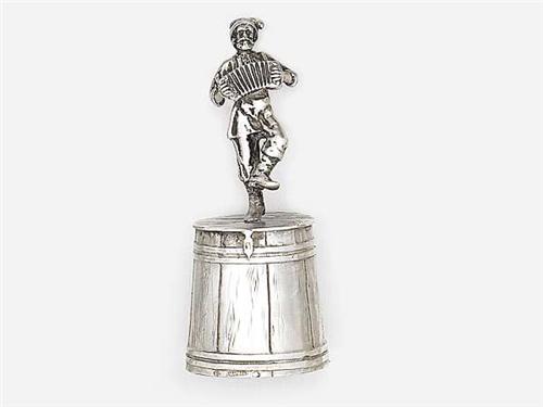 Silver, 60 g. Moujik playing accordion on an upset pail. Marked: Kiev, late 19th century, Josif Abramovics Marsak. Size: 8.5 cm