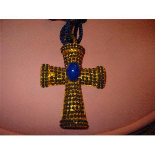 This magnificent, 4 inch goldtone vintage cross, has signature indicates "Vogue JLRY". It is decorated with blue seeds stones, a cabochone dark blue stone with a blue rope chain and a golden closure.The fabric chain is 14 inch. It is a gorgeous costume jewlery. few missing seeds.