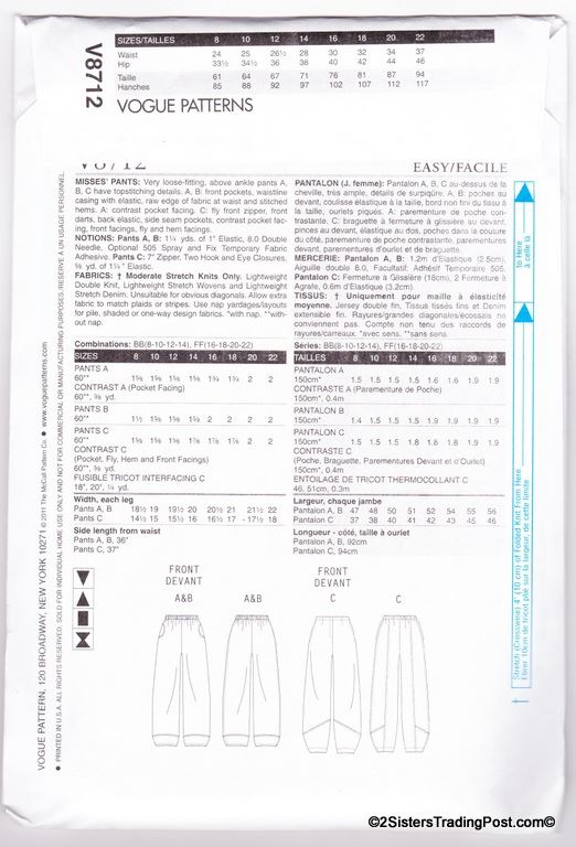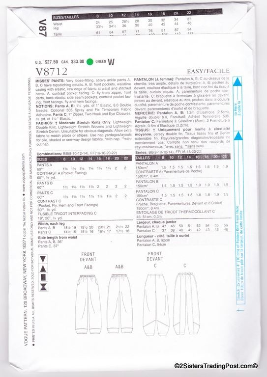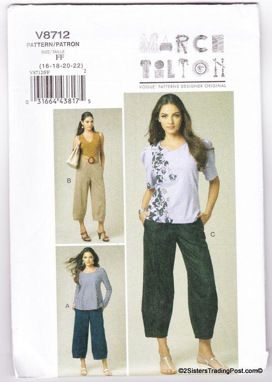 Vogue misses' pants pattern #V8712 by Vogue American designer March Tilton. Size FF 16-18-20-22 MSRP $27.50