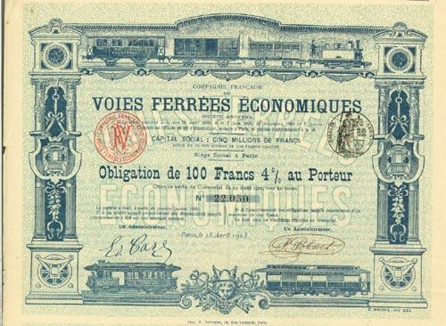 1902, France. Bond bearing 4% interest. Green/Blue. Very ornate border of train cars. Uncancelled. Very fine.